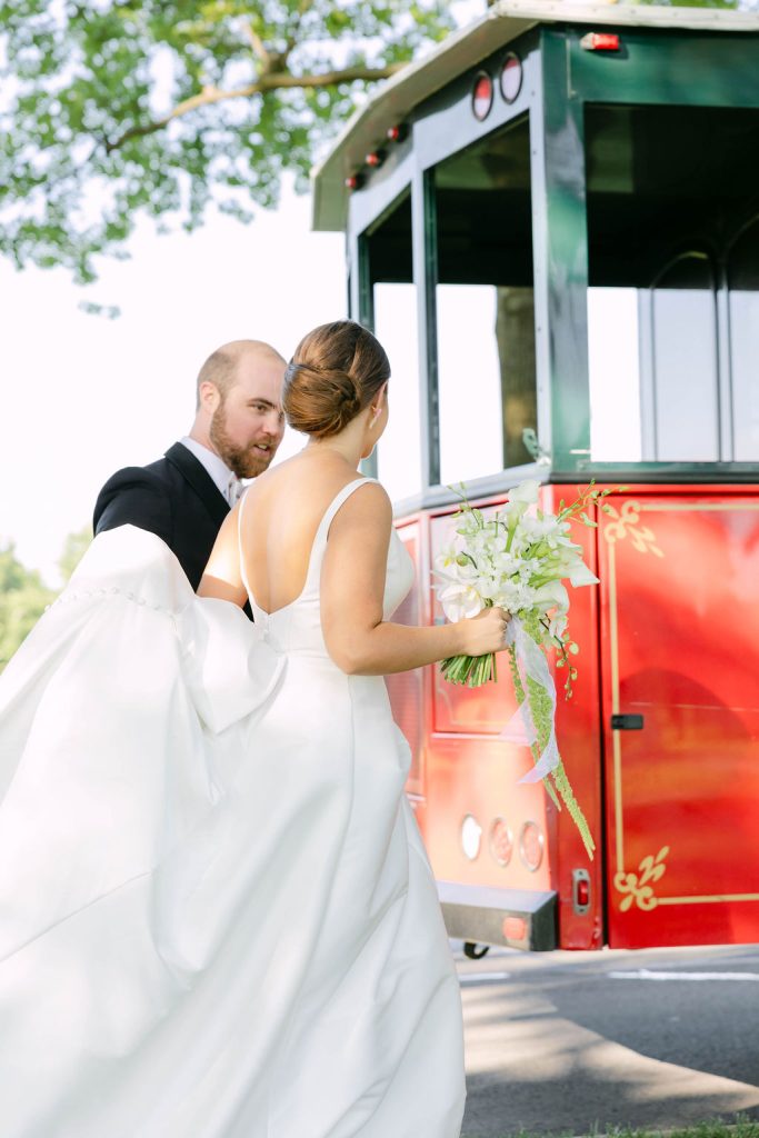 To make the transition from ceremony to reception even more memorable, the wedding party hopped aboard a charming trolley from Old Urban Trolley. The ride kept the celebration seamless while adding a whimsical, old-world charm that delighted guests.