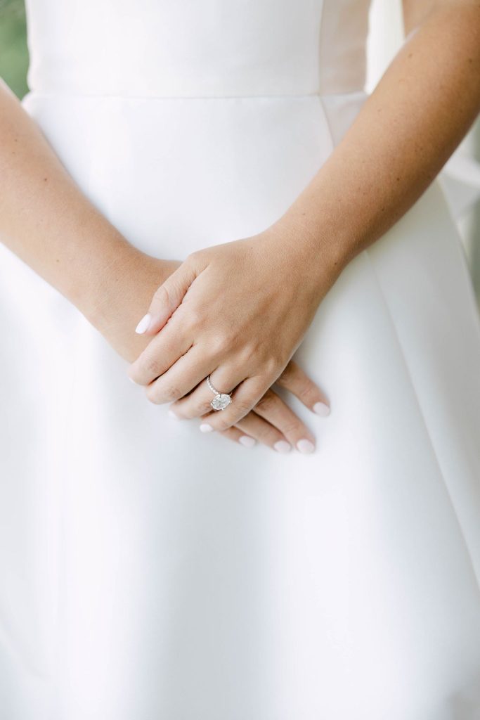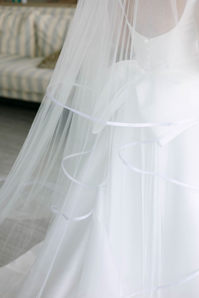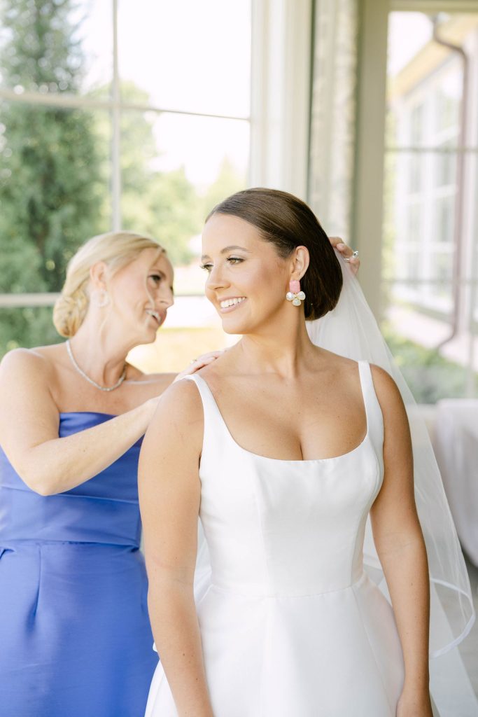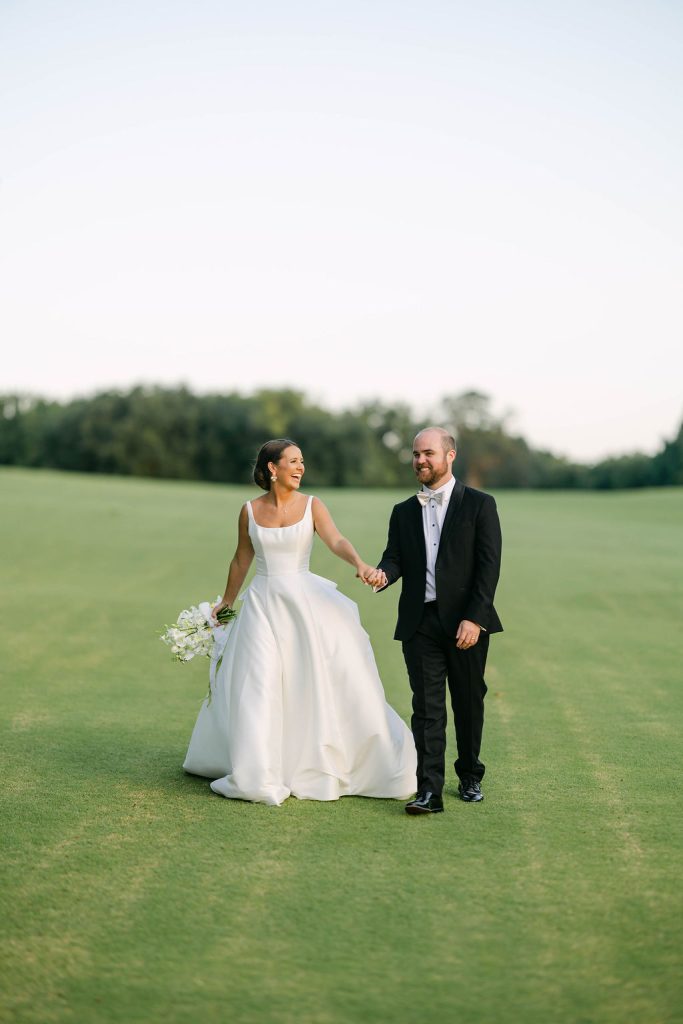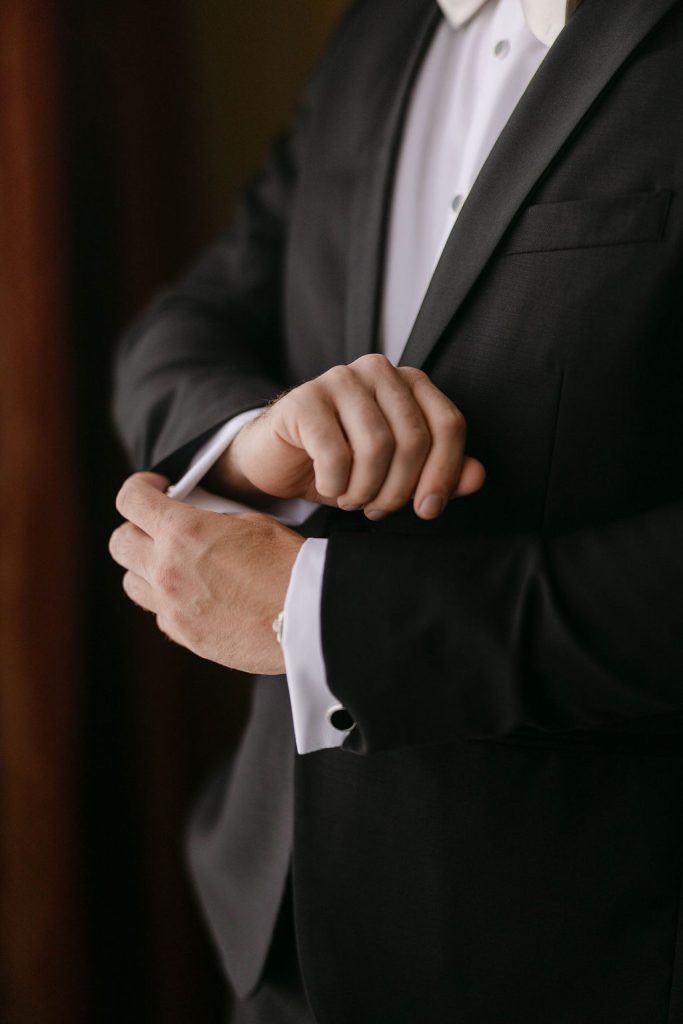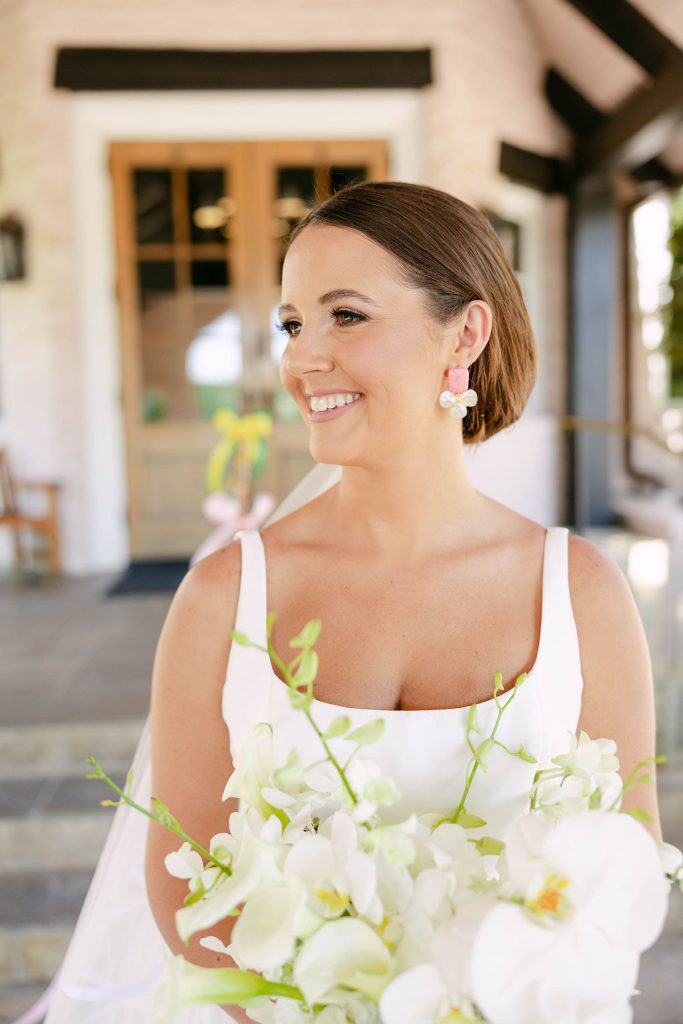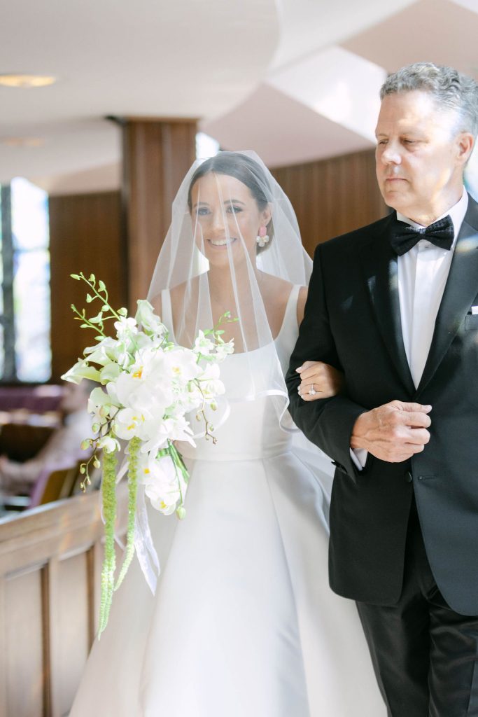 Abby looked radiant in her gown from La Mariée Boutique. The sleek design featured a structured bodice, a full skirt with dramatic volume, and a statement bow detail in the back. Paired with a classic veil, the look was timeless and elegant. The clean lines of the gown perfectly matched the chic aesthetic of the day, while still letting Abby’s personality and joy shine through.