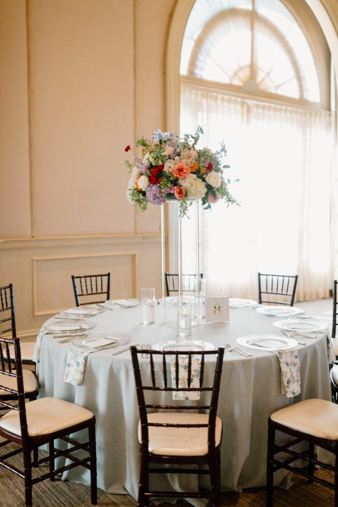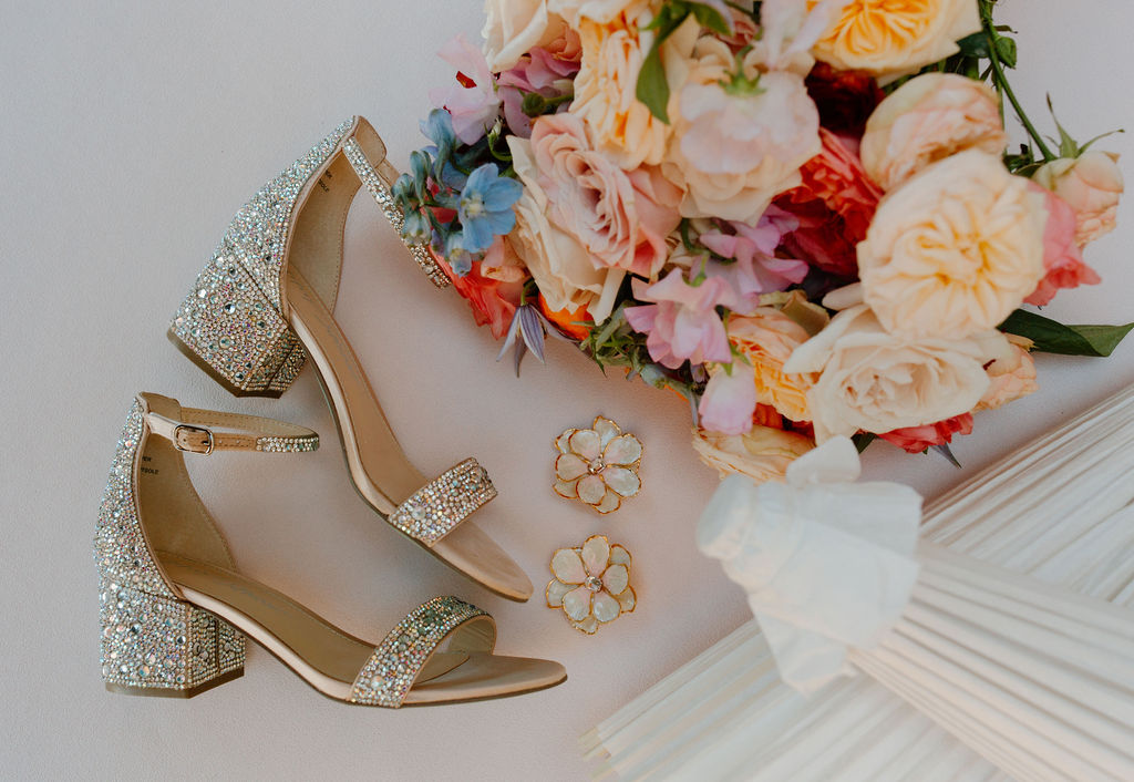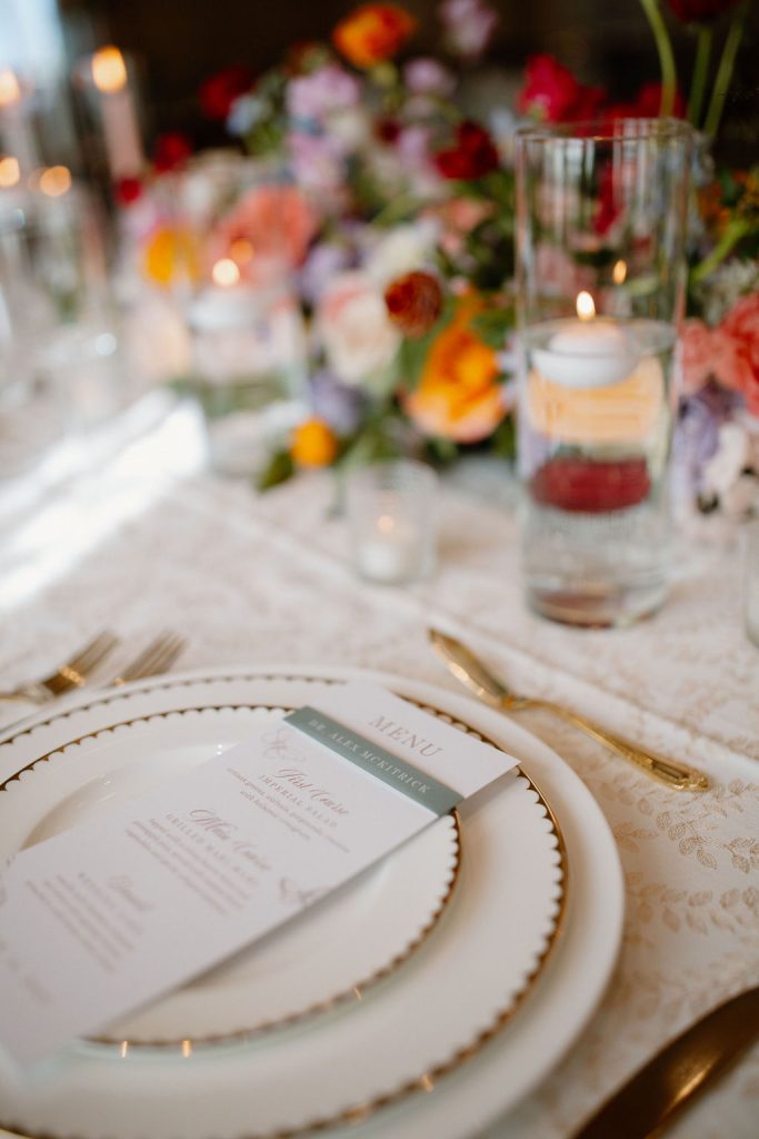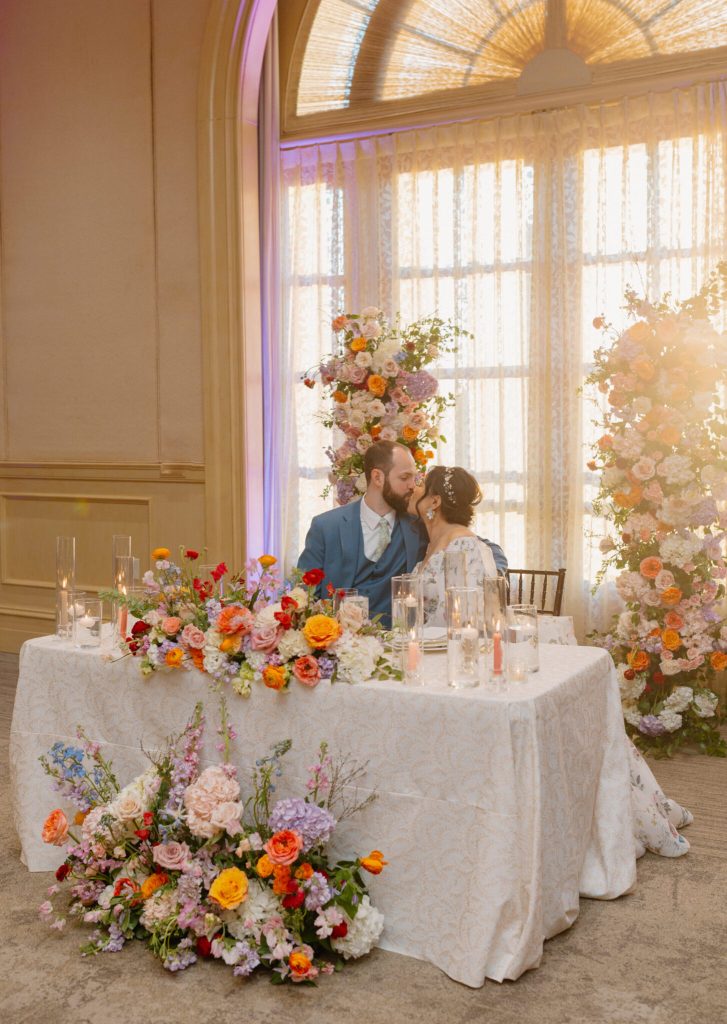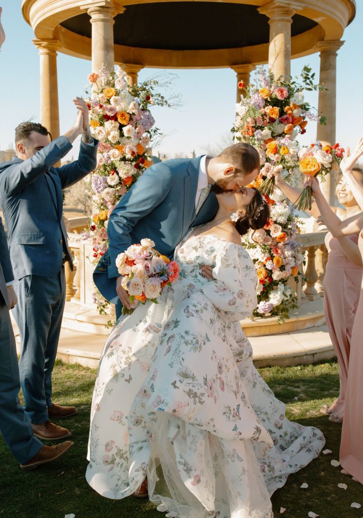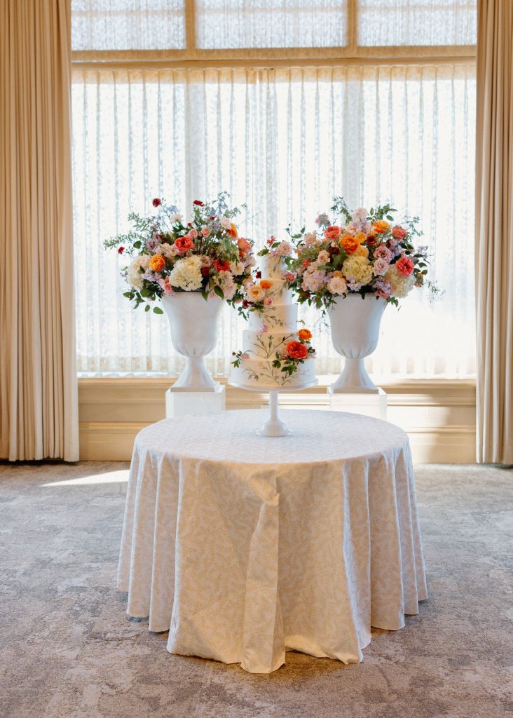 Their outdoor ceremony featured a stunning floral altar adorned with multi-colored blooms by Poppy Lane Design. Florals were a central design element, from the bride’s ensemble to the intricate floral accents on their gorgeous cake by Amy Cakes.