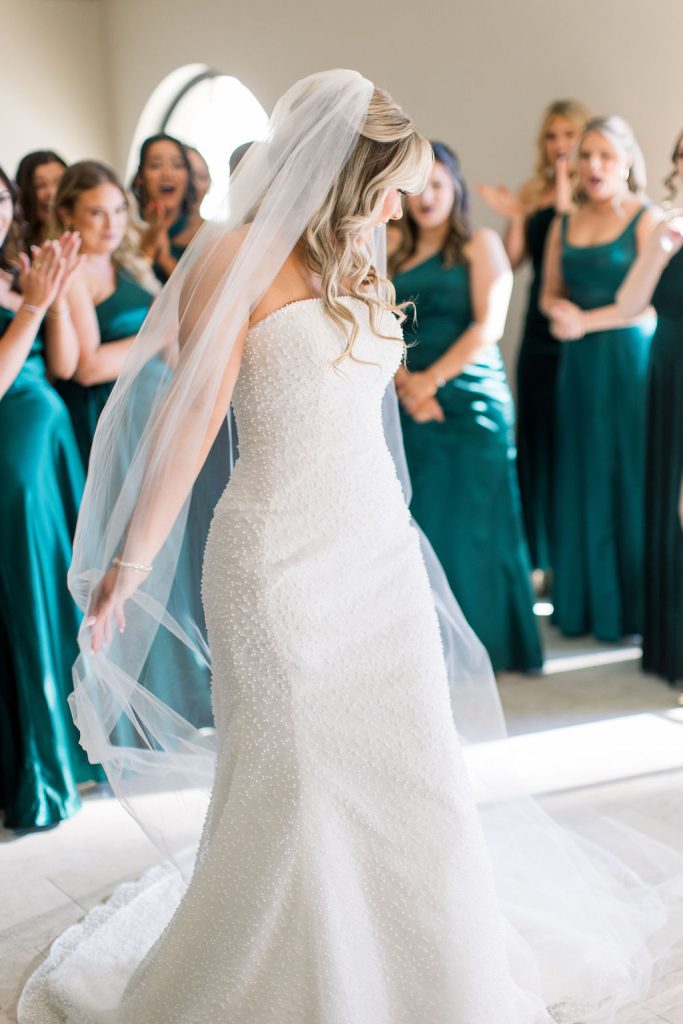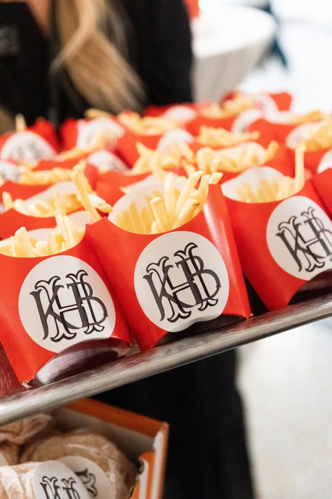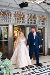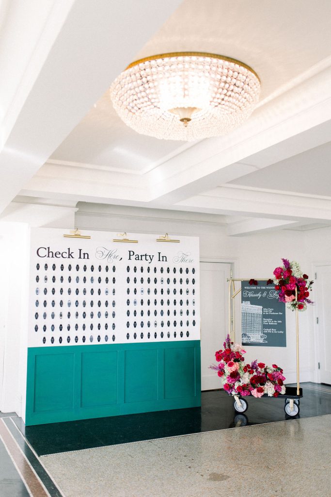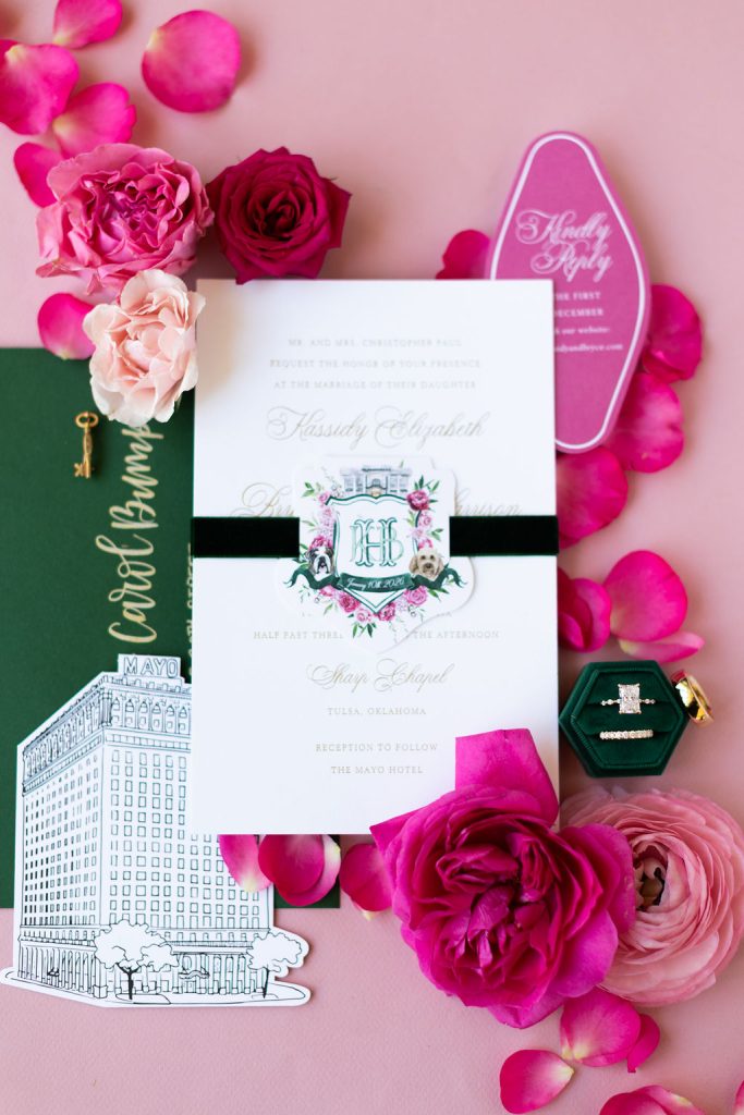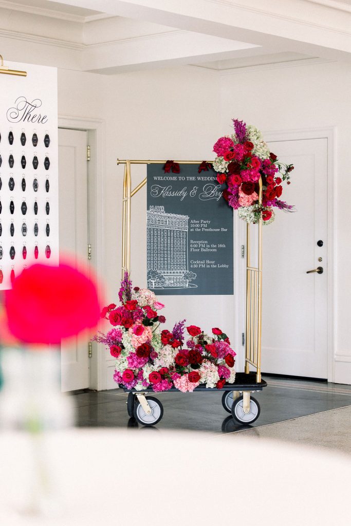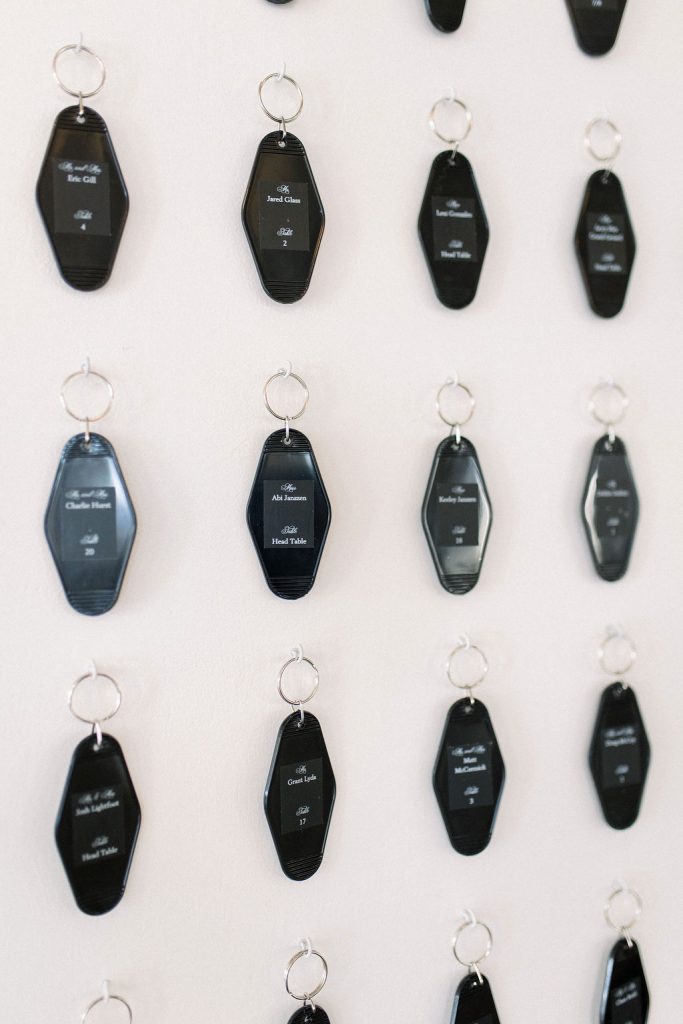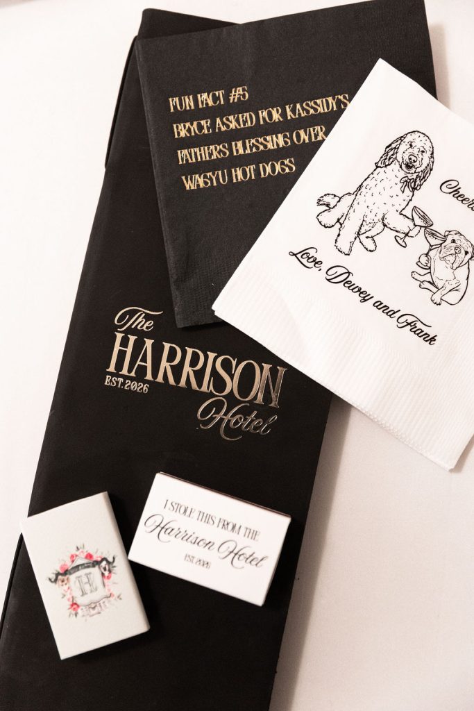 Kassidy, the bride, works in the hotel industry, which served as a major inspiration for the details of her wedding day, planned by Embellished Weddings. The reception venue itself, the iconic Mayo Hotel in downtown, perfectly set the scene. They incorporated a charming play on their last name with the phrase “The Harrison Hotel,” featured on items like hats, koozies, and matches. Stay Gold Event Rentals created a unique seating chart using vintage motel keys as name cards, which was styled next to a cute bellhop sign featuring a custom illustration of the venue by Alexa’s Illustrations.