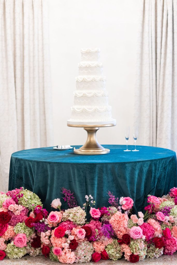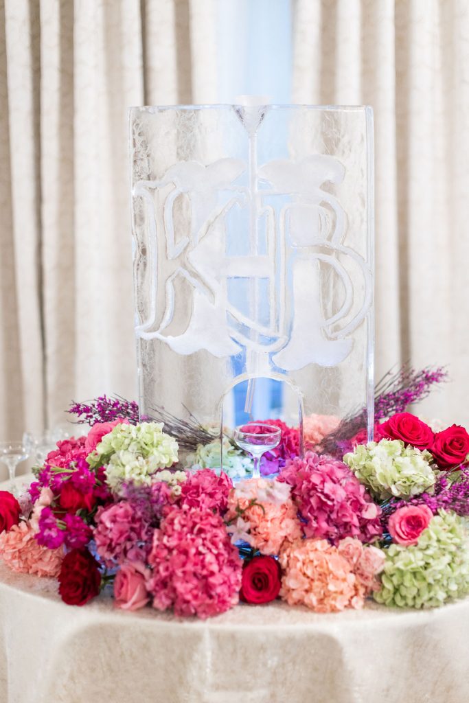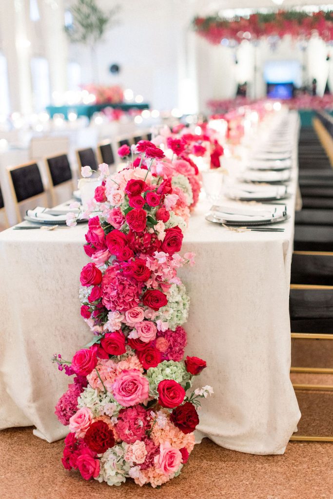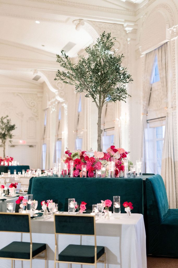 The reception decor was equally notable, featuring gorgeous lounge furniture, a dance floor, velvet chairs, and elegant linens all sourced from Marianne’s Rentals. Florals by Poppy Lane Design added a stunning touch, with pops of pink beautifully contrasting the white ballroom and green accents. A highlight was the hanging floral installation suspended above the dance floor.