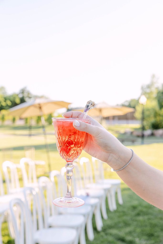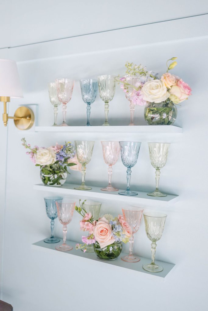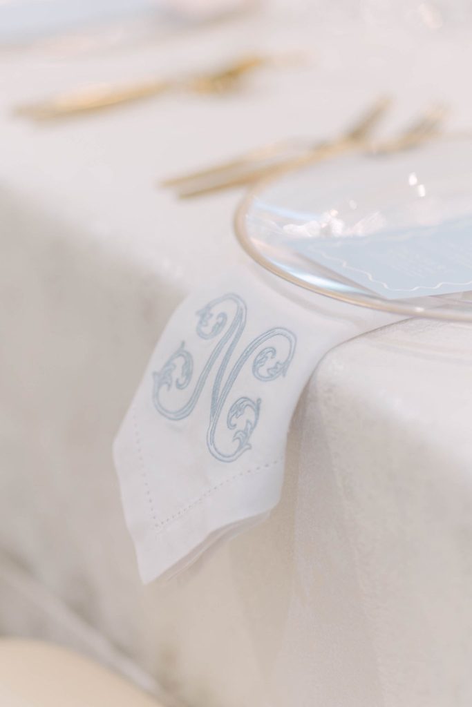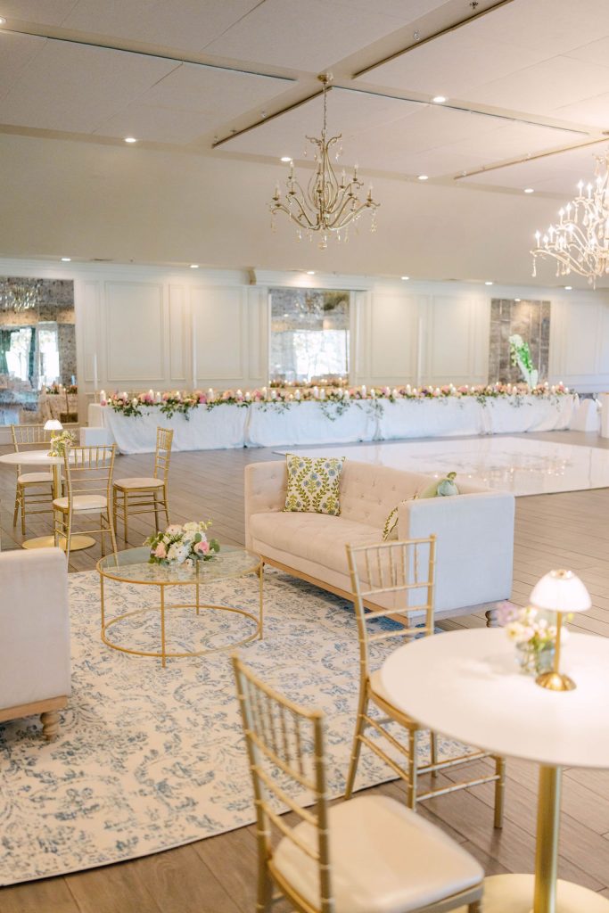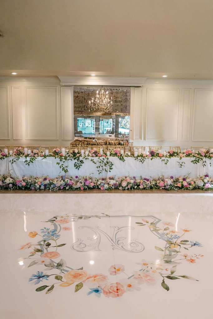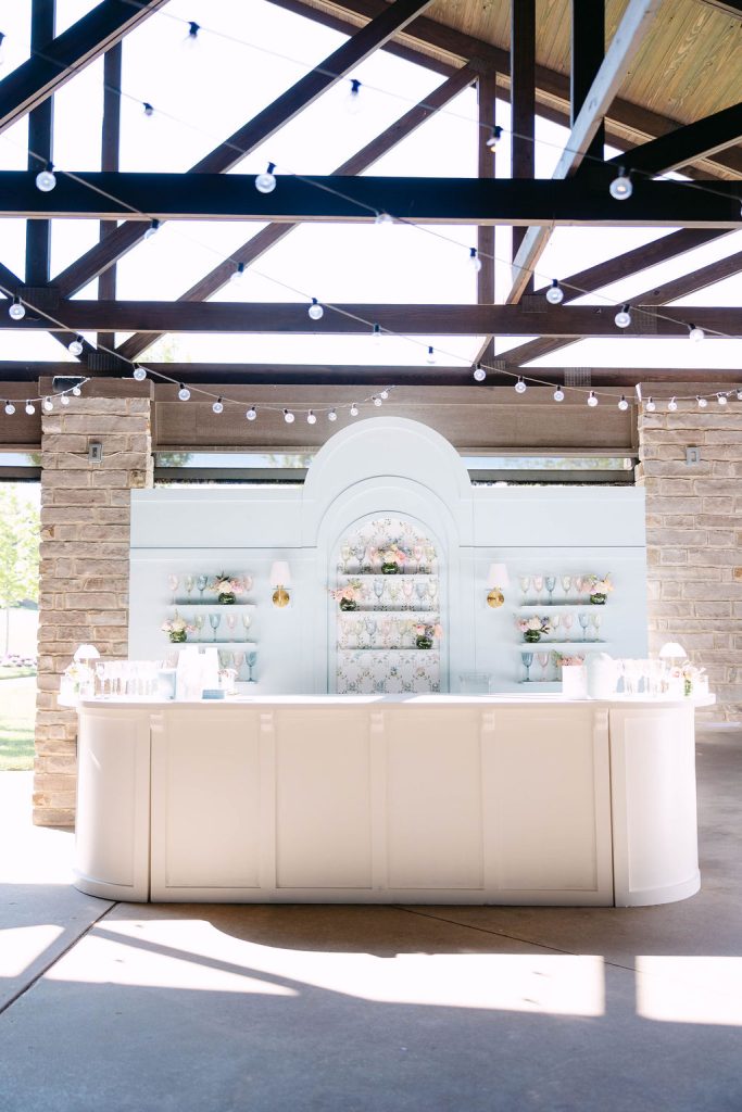 From the moment guests arrived, they were immersed in a floral dream. The showstopping ceremony arch by Tony Foss Flowers served as the most magical backdrop during the ceremony. As the celebration continued into the cocktail hour and reception, design and personalization shined. Mood Events contributed to the custom-designed bar and bar back, both of which were paired with a charming escort card.