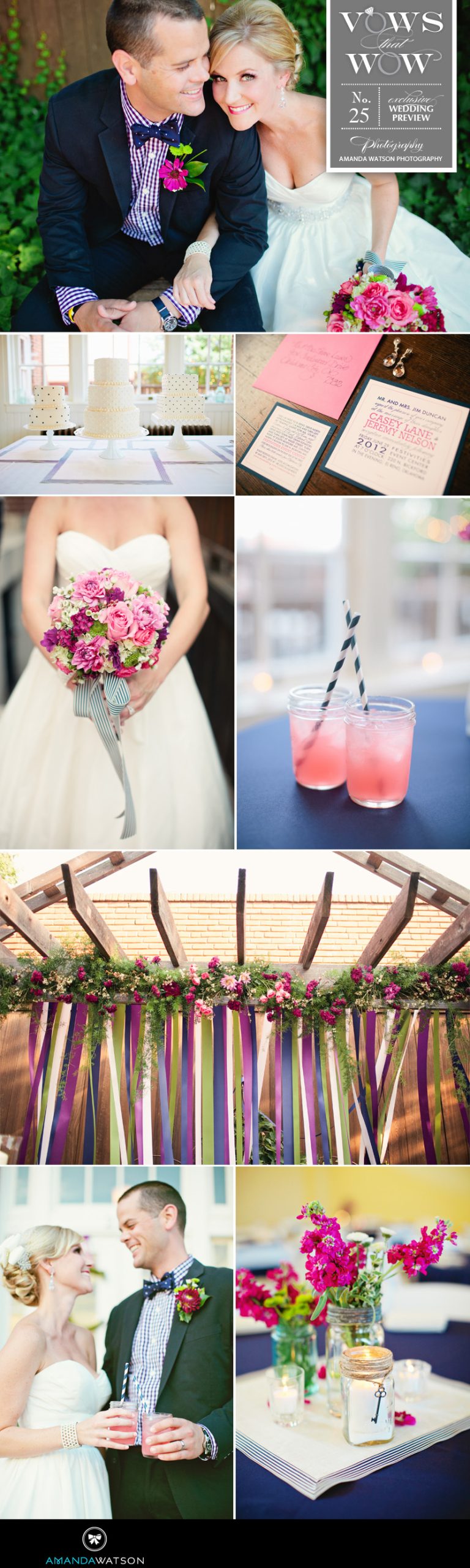 Oh how we love Casey and Jeremy’s sweet summer wedding at Festivities Event Center! The ceremony took place in the venue’s garden area under a beautiful arbor draped flowers and ribbons creating the perfect whimsical backdrop. We have to admit that we adore Jeremy’s bow tie and the bride looks stunning in her Wtoo gown and birdcage veil! And have we mentioned that we love the fuchsia, navy and white color combo? So fun! Thanks to Amanda Watson Photography for capturing each lovely detail! Be sure to check out more from Casey and Jeremy’s vintage wedding in the upcoming issue of Brides of Oklahoma. Cheers!