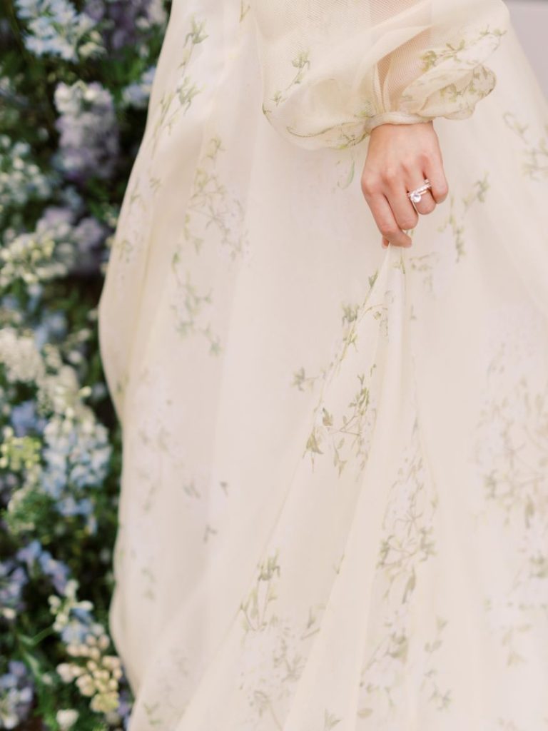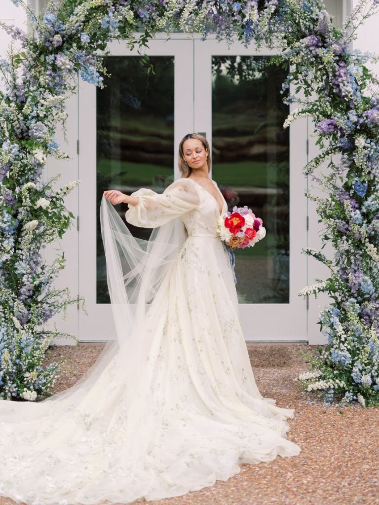 Bride and groom both look chic as can be, with our bride modeling a romantic, long-sleeved Monique Lhuillier gown from J.J. Kelly Bridal Salon, adorned with natural details and paired perfectly with effortless hair and makeup styled by Chelsey Ann Artistry. It has to be 10s across the board from us while looking through the full gallery from this waterside wedding inspiration. See more from this styled shoot down below!