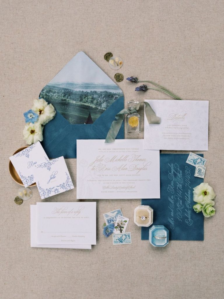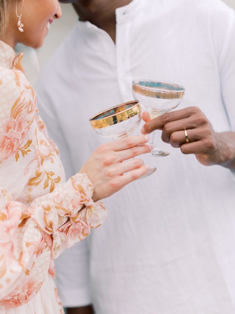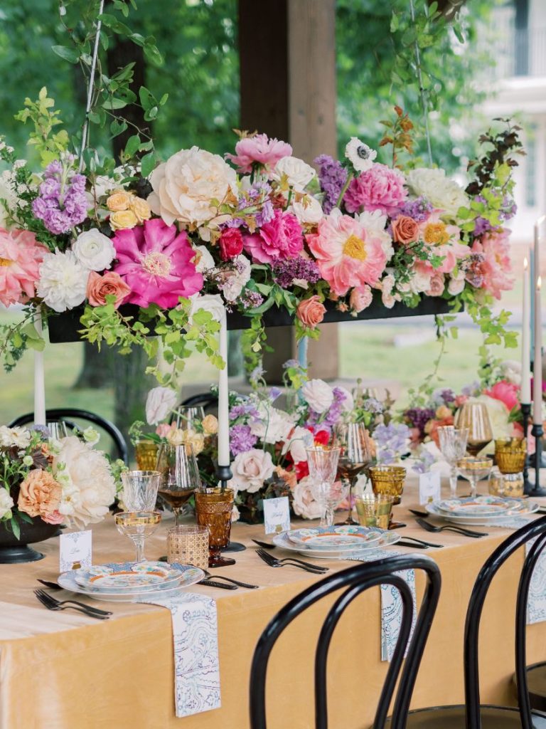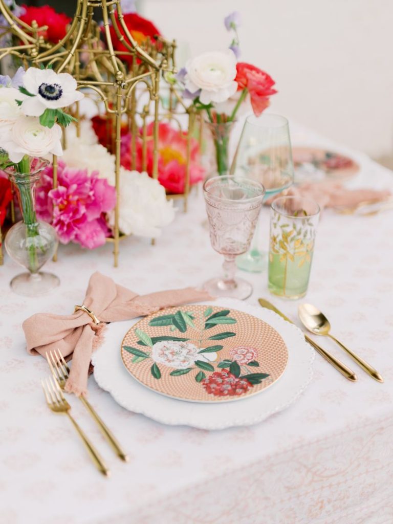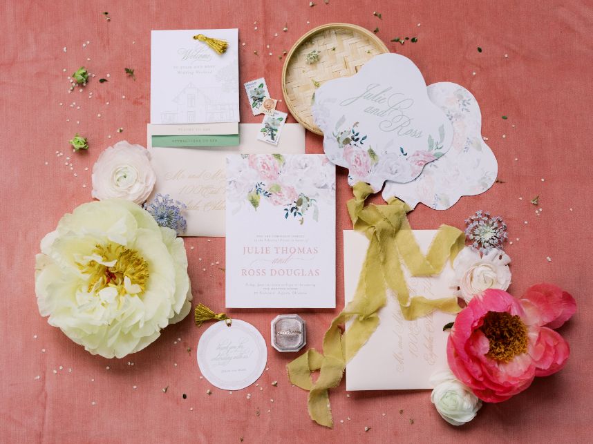 In one scene down below, an altar of pale blue florals takes our breath away while in others, cheery pink blooming centerpieces are oh-so-fun to look at all thanks to Poppy Lane Design and their expertly crafted floral installations. Two distinctly beautiful sets of paperie designed by Eros Studios steal our hearts from the get-go, enveloping scripted save-the-dates in a luxurious, illustrated insert as well as covering a pretty pink invitation suite in delicate floral designs. Blending both vibes in outdoor reception seating creates a totally unique garden party-meets-Seaside, Florida feel thanks to décor from Party Pro Rents.
