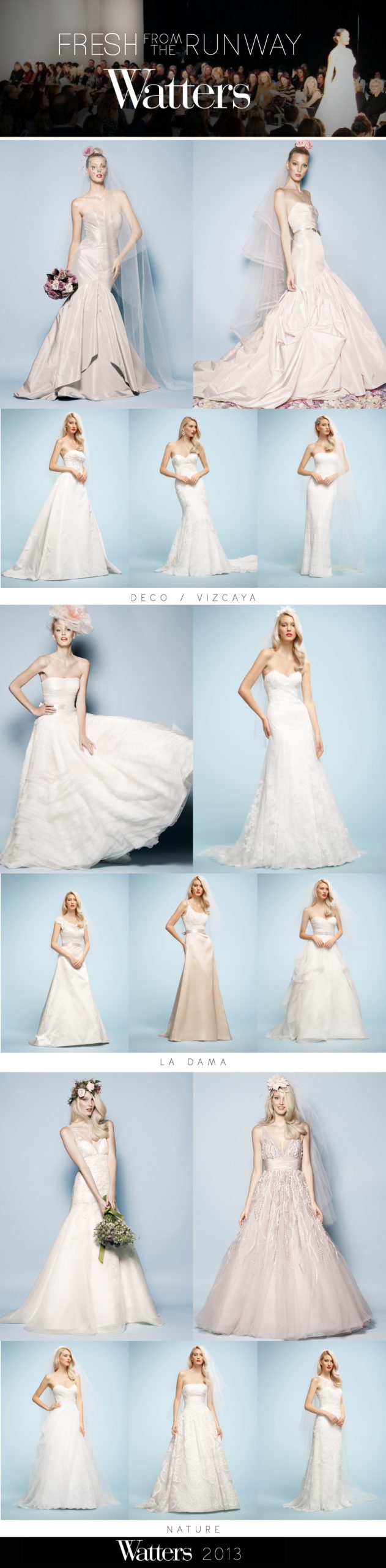 Introducing the latest designs from Watters’ 2013 collection! This Dallas-based design house has blown us away with a truly incredible group of wedding gowns that have left us swooning. Their 2013 collection is broken down into three groups — Deco/Vizcaya, La Dama and Nature. The Deco/Vizcaya gowns feature clean lines mixed with intricate renaissance scrolls and elaborate draping for a modern twist! For the very feminine bride, La Dama feature luxurious satins, lovely lace and organza with demur neckline. The third group, Nature, was inspired by breathtaking views and features pale pinks, intricate embroideries and beading. Truly something for everyone! Oh how we love Watters! Find Watters locally at J.J. Kelly Bridal Salon.