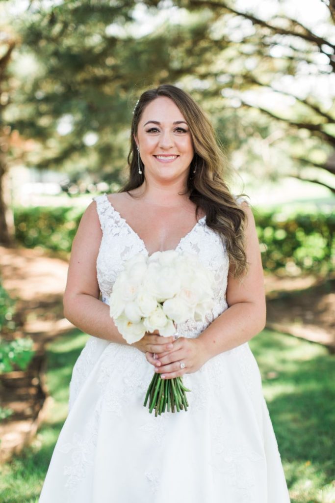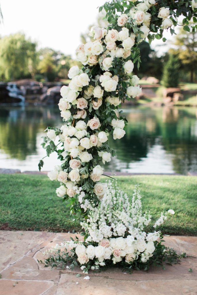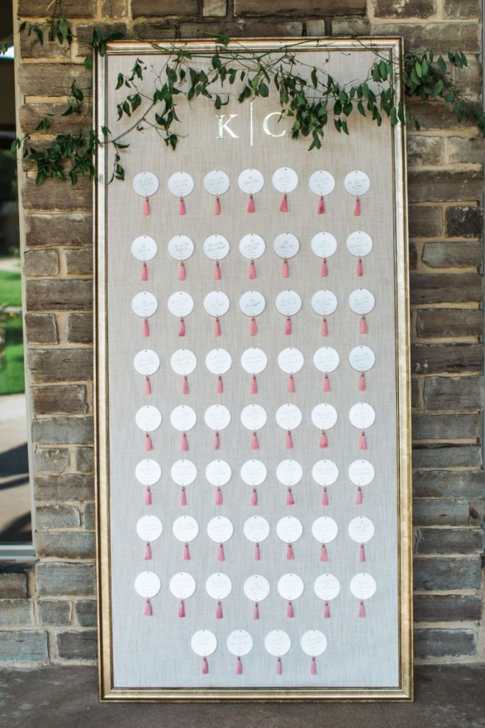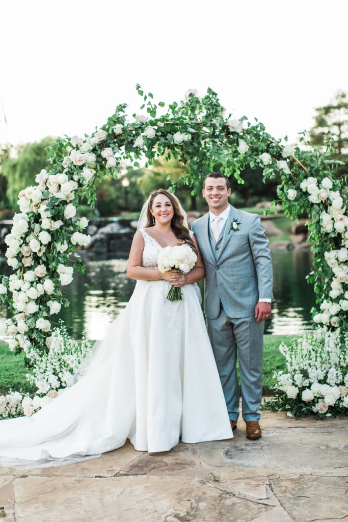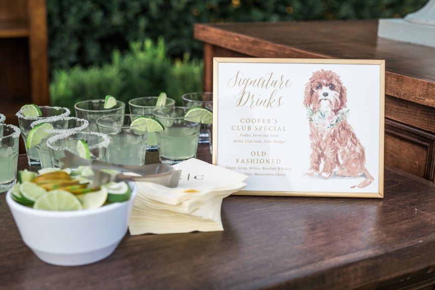 We are completely swooning over Kelsey and Cody’s modern garden party wedding on an August evening at Coles Garden Wedding and Event Center! Kelsey knew the moment she walked into Coles Garden it was the perfect fit for her modern garden party. Decor and rentals from Marianne’s Rentals and Mood Party Rentals completely elevated the space into a modern romantic dream. Tony Foss Flowers’ fabulous floral arch became Kelsey’s favorite element of her wedding. Additionally, the floral arch proved to be very versatile as the backdrop of the couple’s ceremony and then moved inside as the backdrop for their elegant cake from Amy Cakes. Eros Studios worked her magic with invitation suites and a custom bar menu featuring an illustration of the couple’s dog, Cooper. We always love a personal wedding detail, especially when it includes a cute pup!