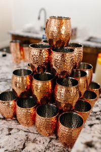 Party Perfect Event Rentals rounded out the look with beautiful rentals including linens, glassware, chairs, place settings, and fun lounge vignettes throughout the venue. From stylish barstools to entry tables and even Moscow Mule mugs – every detail was perfect!