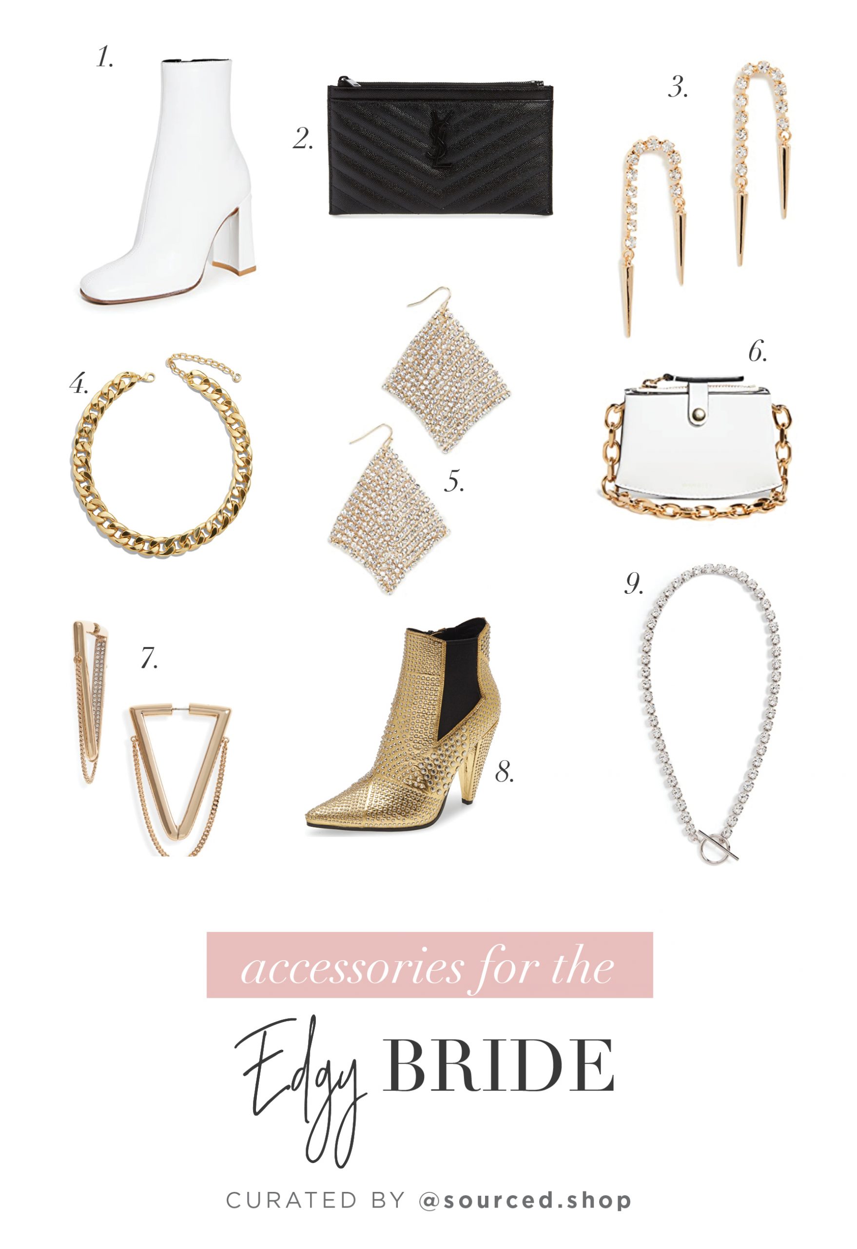 Edgy brides are fearless and ambitious when it comes to wedding style and accessories taste, and we think these pieces embody that edgy feel in the perfect way! Black, gold, glitter and rhinestones set the edgy bridal style apart from the rest, elevating any bridal look to easily be moody and romantic.
