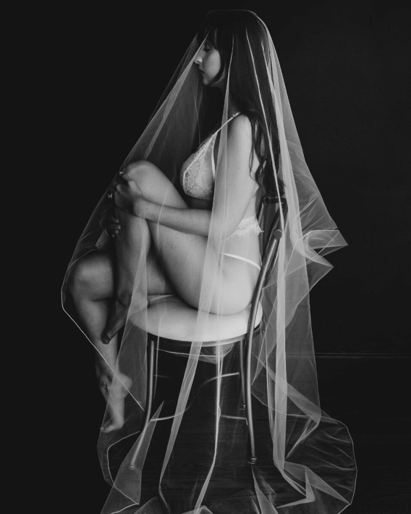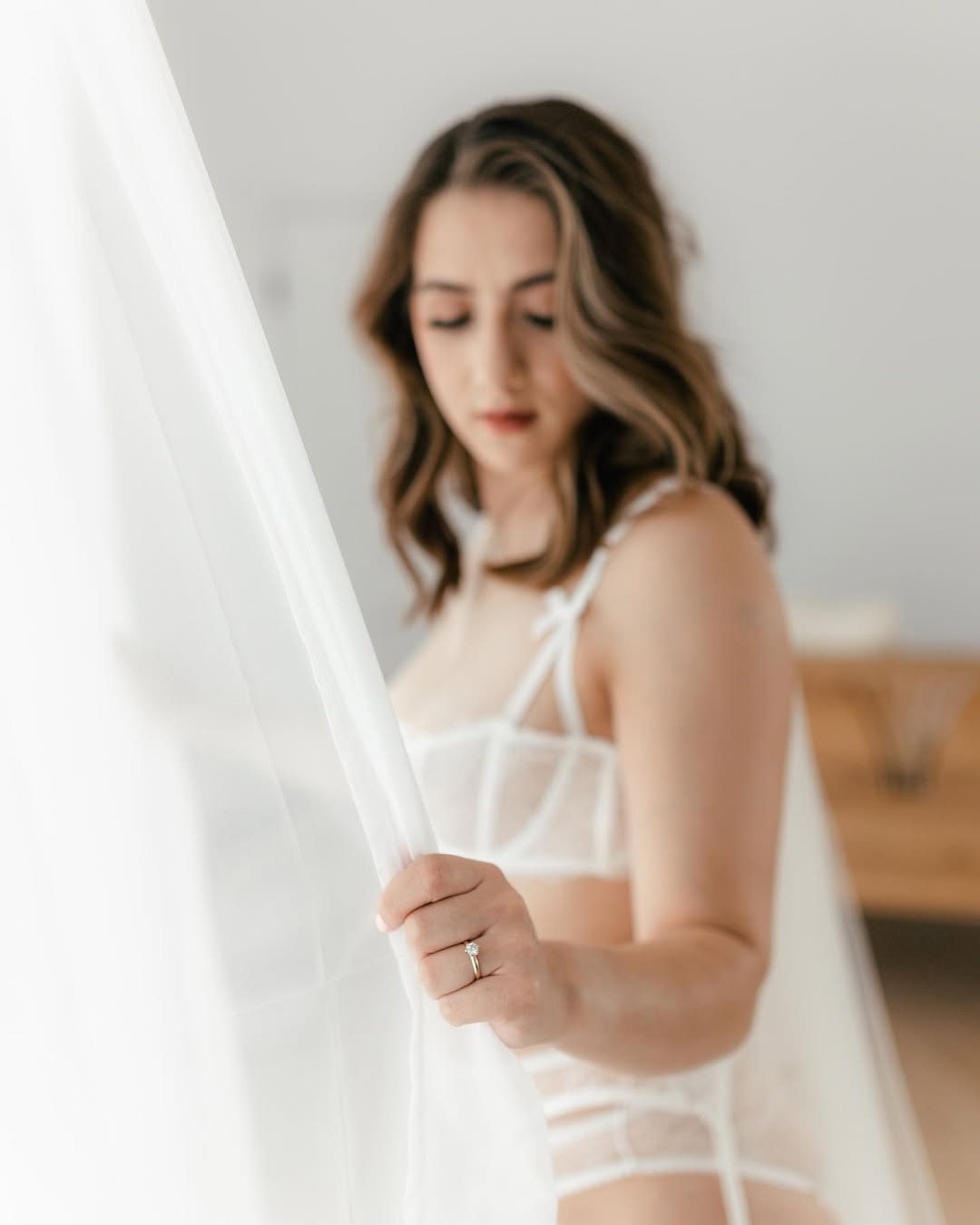 Absolutely not! The goal of boudoir photography is for you to feel like your sexiest self, no matter what that means for you. In boudoir, nudity is often implied but not shown. Your bridal veil, a silky robe, some lingerie or even some of your partner’s clothing can all work as perfect ensembles for your first wedding boudoir session. Feel free to get creative with what you wear to cover up as little or as much as you’d like. Your flower bouquet, accessories, and bridal shoes can also add an extra touch of personalization to photos. We’ve also seen brides wear their favorite sports jersey, jeans, and oversized button-up shirts. It’s truly all about what you want to wear to feel like your best self! Additionally, open communication between both you and your boudoir photographer can help determine how heavily your photographer plans to retouch your photos, if at all.