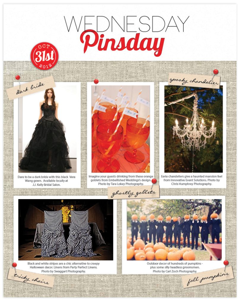In honor of Halloween, we’ve found a collection of dark details for all your haunting desires. A black Vera Wang gown will make a bold and chic statement. Glowing chandeliers and bright orange goblets will give your soiree a haunted feel without being cheesy. Black and white stripes liven up the scene for a festive affair. And of course, keep it fall fabulous with an bounty of pumpkins. Happy Halloween pinners!