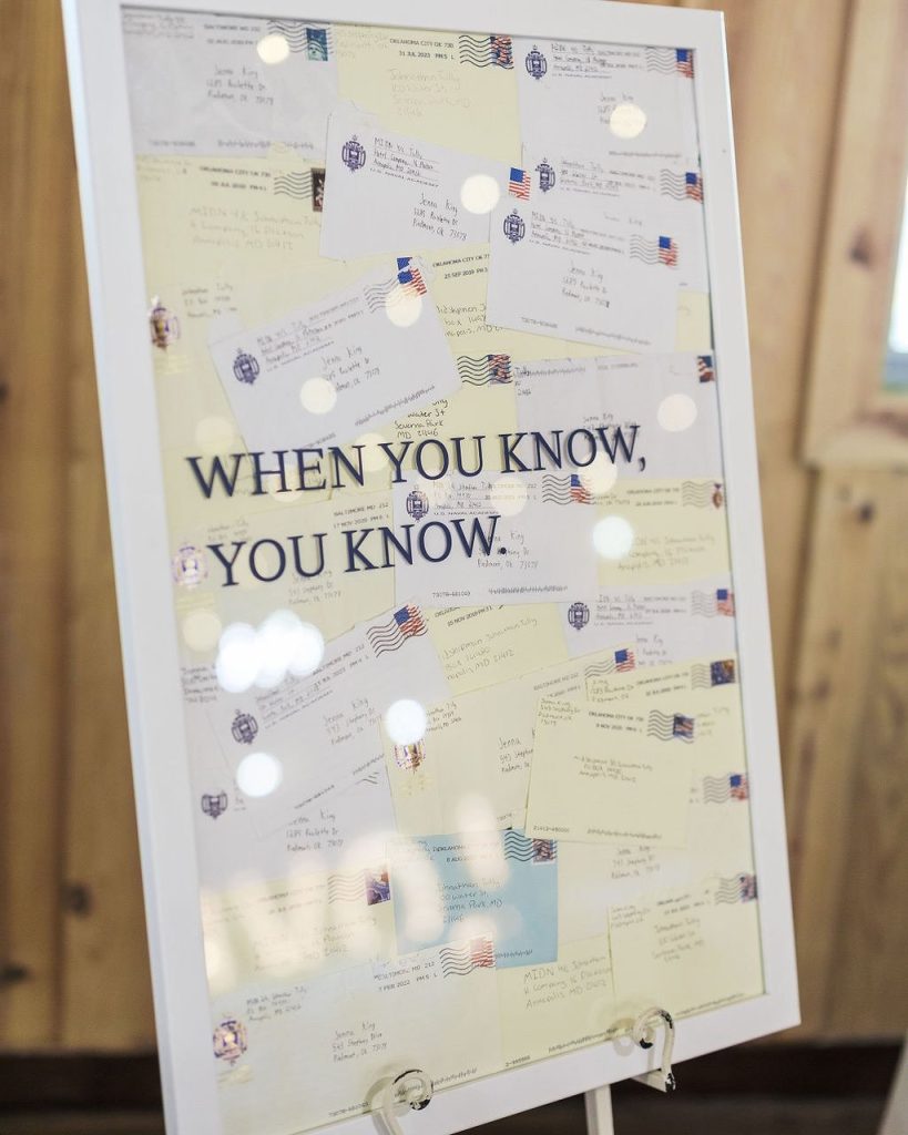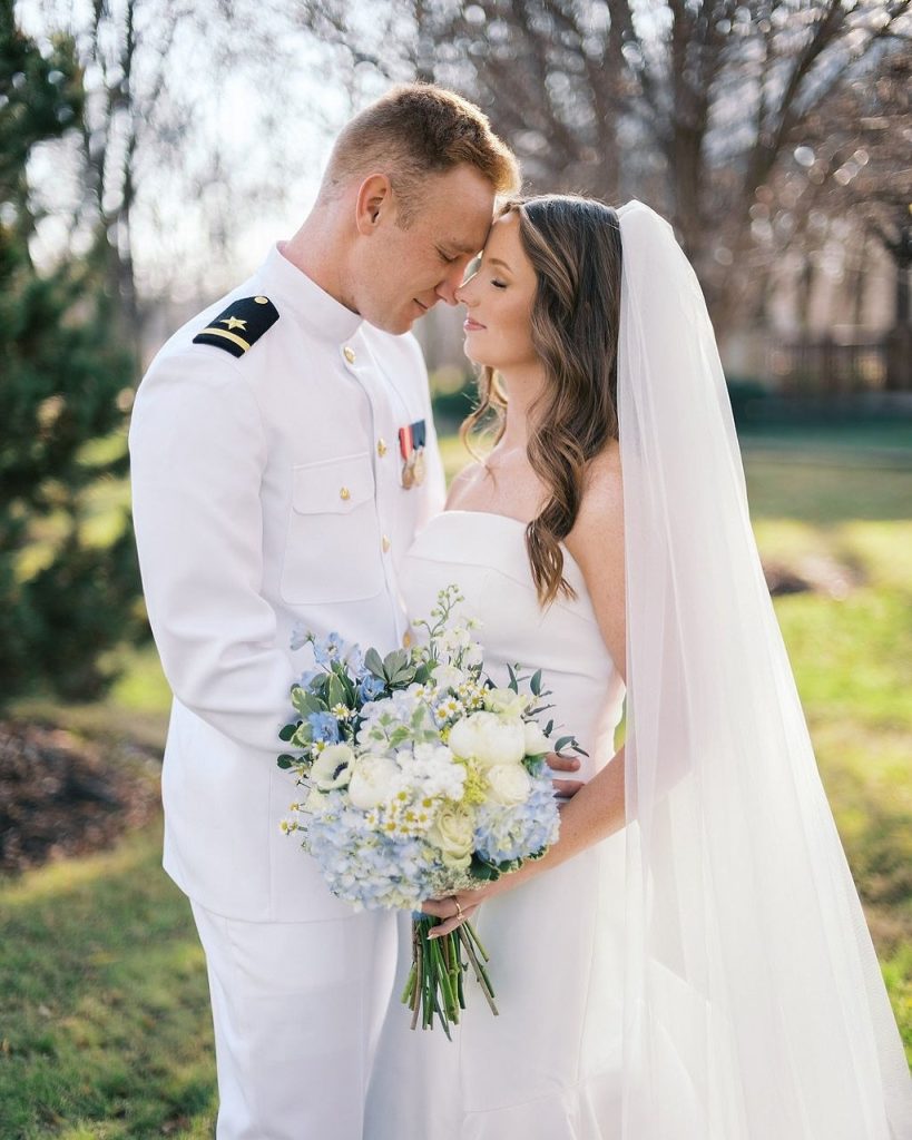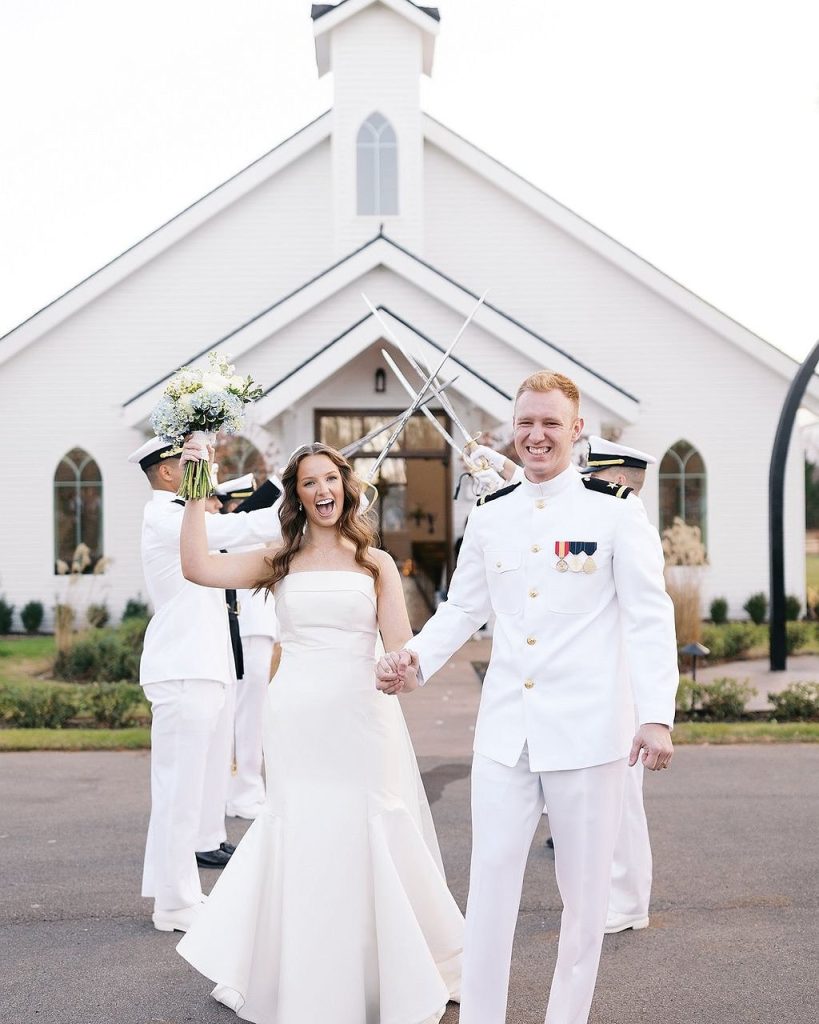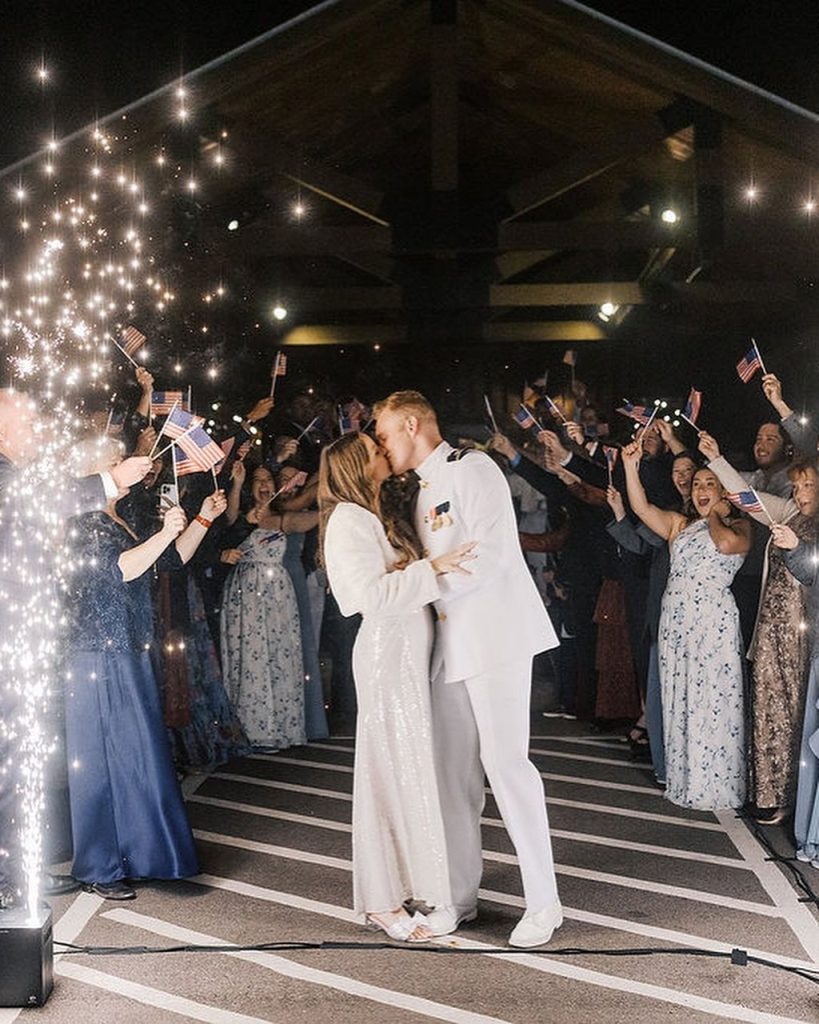 The ceremony ended with a classic sword arch, and the reception featured a sentimental display of letters exchanged during Johnathan’s Naval Academy training. From a stunning dress change to an all-American exit with flags and cold sparks from All Out DJ, every part of the day reflected their love story in the most personal way.