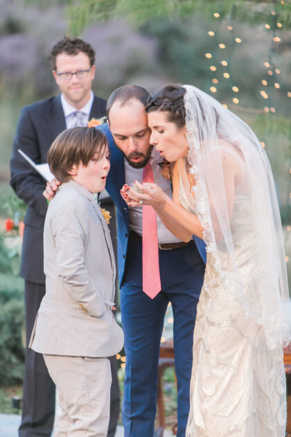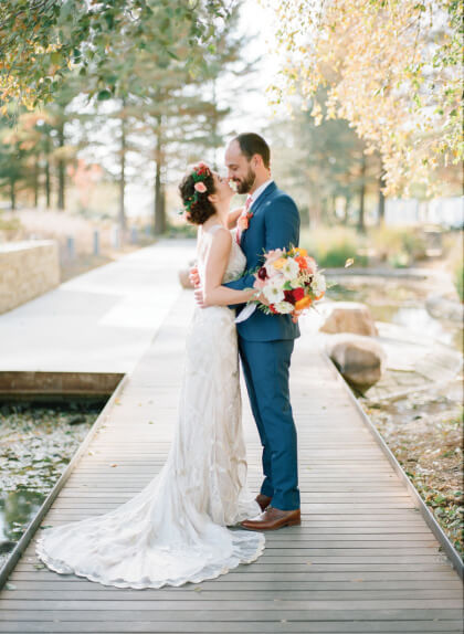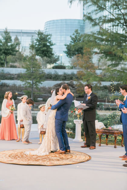The couple began planning a beautiful wedding with the help of the brilliant Camden Chitwood of Emerson Events. On November 15, 2014, friends and family gathered at the Myriad Botanical Gardens in Oklahoma City to celebrate Amber and Eric’s union. The bride wore a champagne art deco-inspired Maggie Sottero gown with ornate beading and a plunging neckline. She walked down the aisle with her father and her son, Julian, by her side. It meant a lot to the bride to have her son close throughout the ceremony. After exchanging personal vows, the new family of three incorporated a special tradition and made a wish together by blowing dandelions toward their guests.