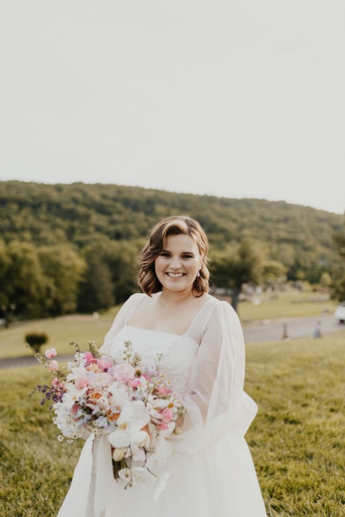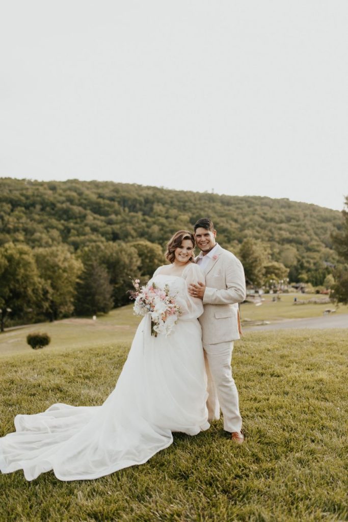Once reality set in, the two began planning their whimsical vintage wedding. Close family and friends were invited to an intimate wedding with invitations from The Letter Box featuring the chapel’s facade. Inside the breathtaking chapel at Big Cedar, the most beautiful whimsical floral arch adorned with light pink blooms was their ceremony focal point. Shelby walked down the aisle in a custom gown from Valentine Bridal. With sheer long sleeves and a big bow on the back, Sonni from Valentine Bridal created the perfect vintage-inspired gown. Of course, we can’t forget about our groom. Alaric looked handsome in a khaki-washed suit from EVERYMAN. After the two said, their “I do’s,” the couple and guests made their way to their whimsical vintage reception. Party Pro Rents provided rentals that made for a picturesque vintage dinner party under the evening summer sky. Also, how could we forget one of our favorite details from Shelby and Alaric’s wedding, a personalized portrait of the couple and their pup from Amy Lee Illustrations. The couple had guests sign the picture in place of a guest book. We absolutely love this idea! Underneath the sunset, Shelby and Alaric enjoyed the company of their guests, great food, and lots of dancing to end their perfect wedding weekend. Keep scrolling to see all the images in this whimsical vintage wedding.