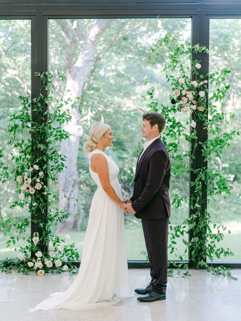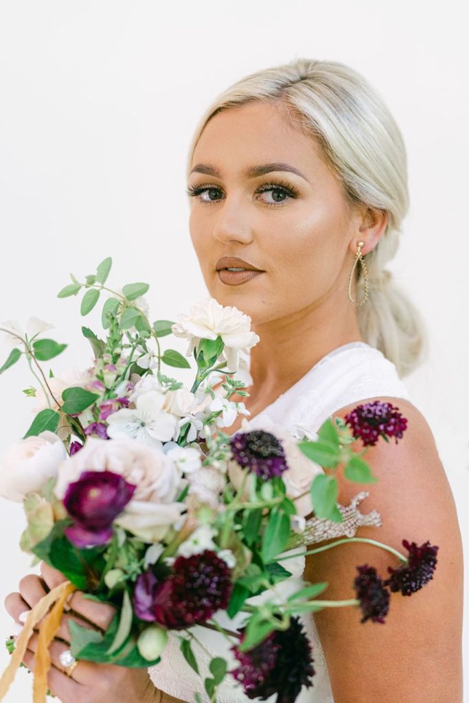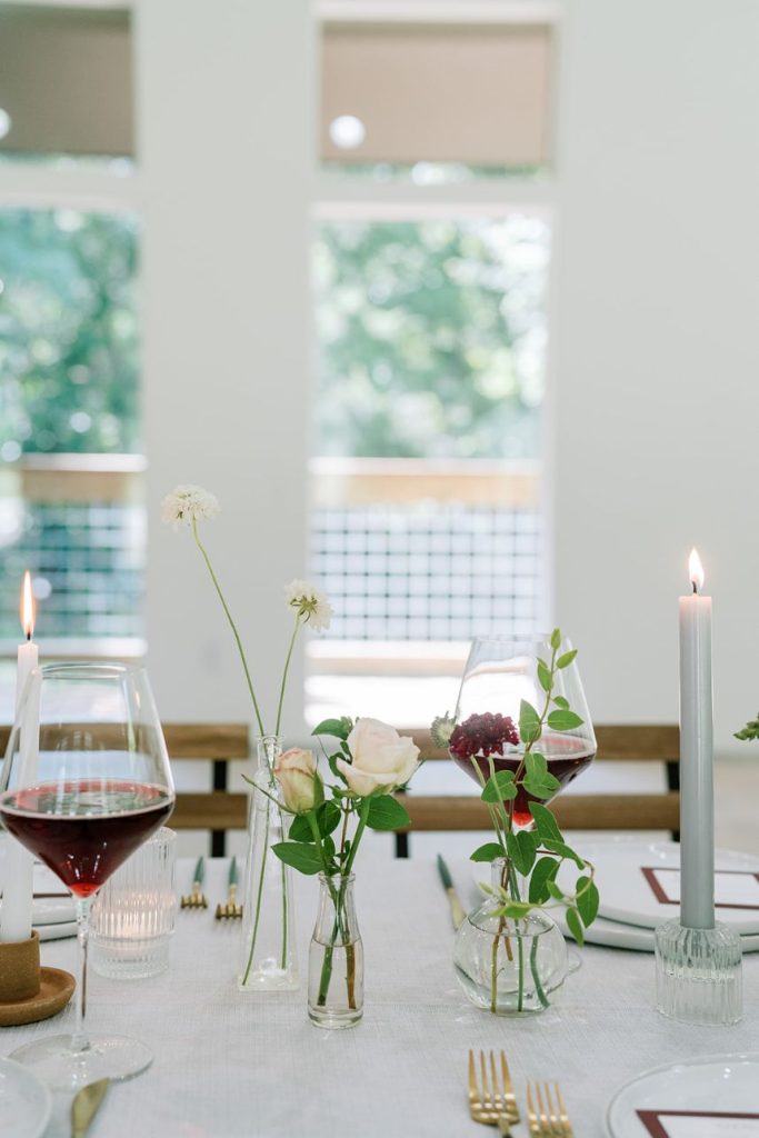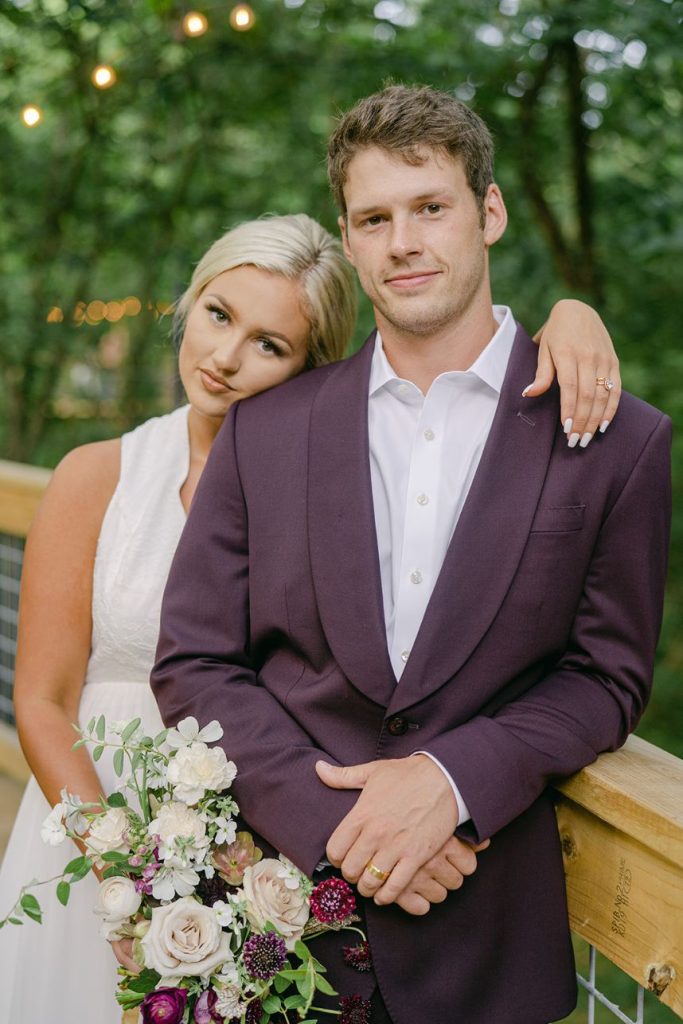 From the photographer, Danielle Villemarette & Co.: “Merrick Hollow is a gorgeous modern venue that has a treehouse feel to while all the beautiful white space and modern/minimalist touches for any bride or groom to create their dream. They offer two locations for a ceremony to take place (a beautiful outdoor area surrounded by trees and an indoor area with a large statement window as a backdrop). When creating the styled shoot design, we wanted to play on the modern minimalism of the venue. With fall quickly approaching, we decided to bring rich plum tones, while still keeping the colors bright, and applicable to the spring, summer, or fall months. With the July heat being in full force, we chose to keep the ceremony and reception tablescape inside, while using the outdoor spaces for portraits and to enjoy the Bubbles and Brew mobile bar.”