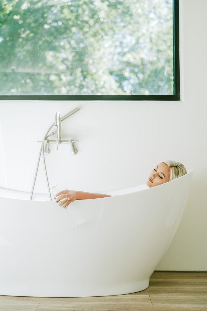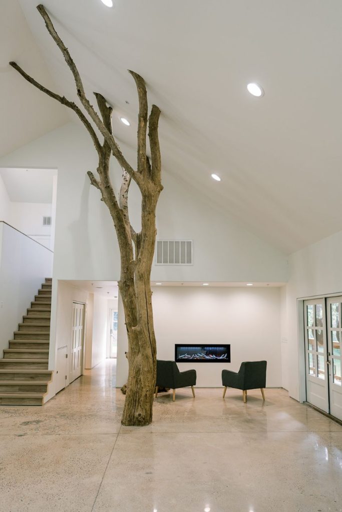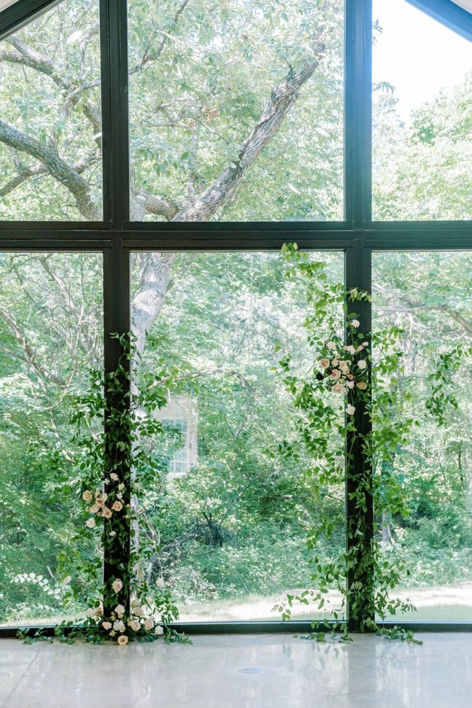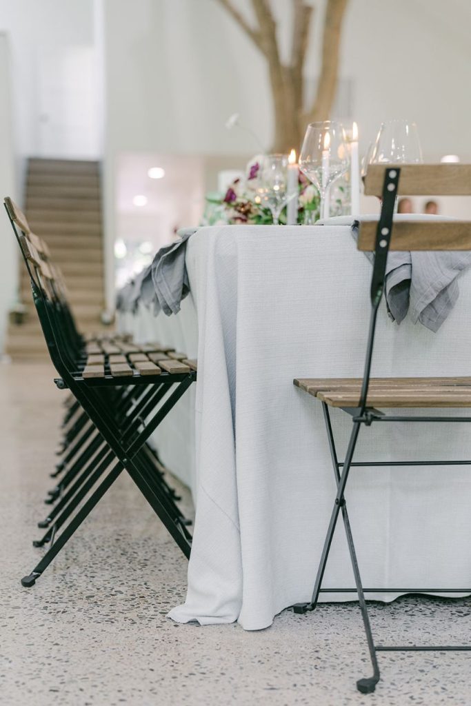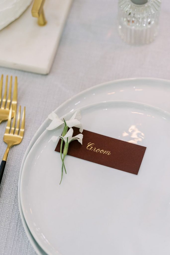 From the photographer, Danielle Villemarette & Co.: “Merrick Hollow is a gorgeous modern venue that has a treehouse feel to while all the beautiful white space and modern/minimalist touches for any bride or groom to create their dream. They offer two locations for a ceremony to take place (a beautiful outdoor area surrounded by trees and an indoor area with a large statement window as a backdrop). When creating the styled shoot design, we wanted to play on the modern minimalism of the venue. With fall quickly approaching, we decided to bring rich plum tones, while still keeping the colors bright, and applicable to the spring, summer, or fall months. With the July heat being in full force, we chose to keep the ceremony and reception tablescape inside, while using the outdoor spaces for portraits and to enjoy the Bubbles and Brew mobile bar.”