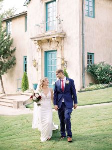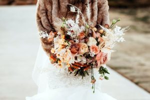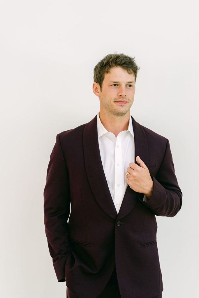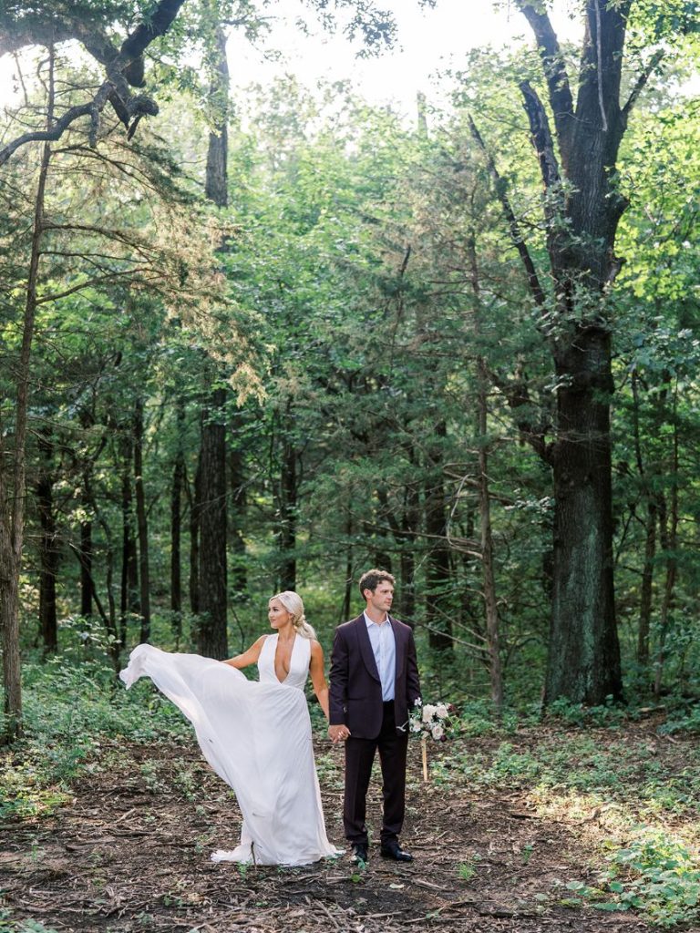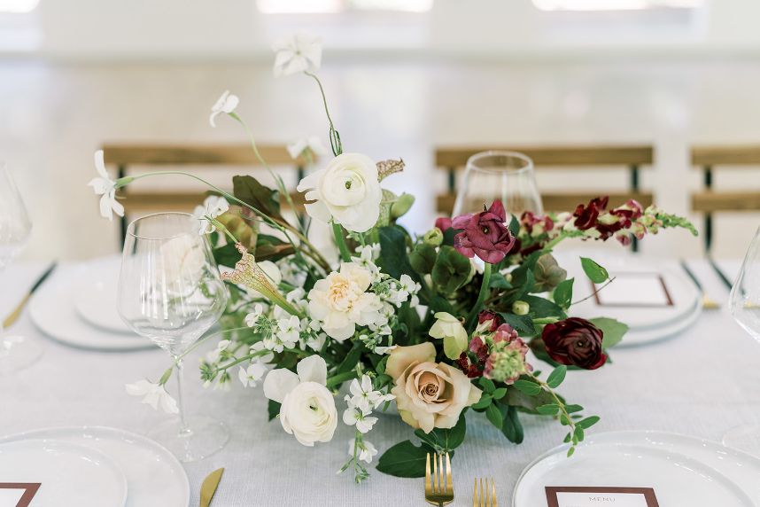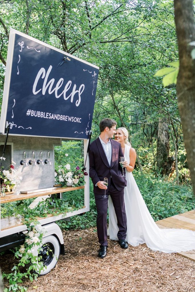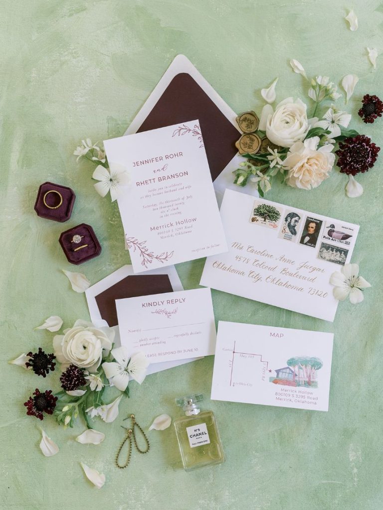 The fall wedding inspiration is a dream come true in this styled shoot captured by Danielle Villemarette & Co. and practically set in the heart of nature, bringing the untamed outdoors to interior spaces! A deep merlot and dove gray palette make this wedding inspiration feel so warm and cozy, while not ruling out its usage in a winter, spring, and even summer wedding as well. Rich plum-toned florals by Anthousai are accented with large ivory roses spread throughout wild-textured greenery in a lovely, overgrown altar installation. Effortlessly elegant table linens from Marianne’s Rentals as well as opulent crystal decor come together in the most tasteful way to make romantic-meets-minimalism tablescapes in no shortage of opulent flatware and details. This edible art deco design by Amy Cakes looks like a colorful Chihuly blown glass piece straight out of the OKC Museum of Art and is made up of four tiers of delicious goodness! The Letter Box designed an autumnal yet fresh invitation suite perfect to set the tone for this transitional wedding inspiration and we love the maroon botanical details adoring this pretty paperie. Serve guests cocktail hour in style with the Bubbles and Brews mobile bar serving up on-tap prosecco and craft beer – an adorable and fun addition to any event. Read on for a note from the photographer about this stunning fall wedding inspiration’s darling details as well as the vision behind it all. Cheers!
