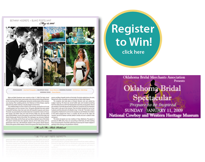 The Brides of Oklahoma is a proud sponsor of the Oklahoma Bridal Spectacular Bridal Show this weekend – January 11, 2009 from 1 – 5 p.m. at the Oklahoma Cowboy and Western Heritage Museum located at 1700 N.E. 63rd Street in Oklahoma City. The show is going to be truly SPECTACULAR and one that you don’t want to miss! Best of all, The Brides of Oklahoma is giving away a free bridal announcement page in the magazine to one lucky bride who pre-registers to attend the show online. So, don’t delay…only those who register online have a chance to win!!