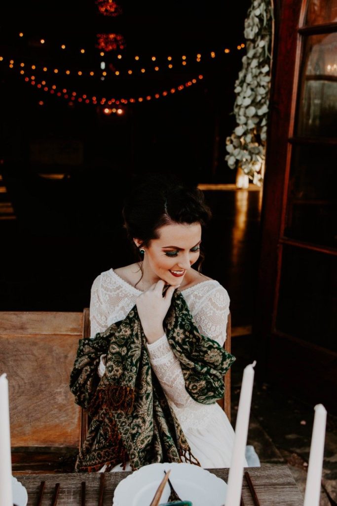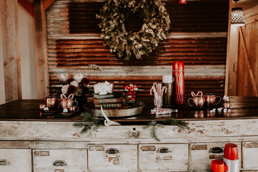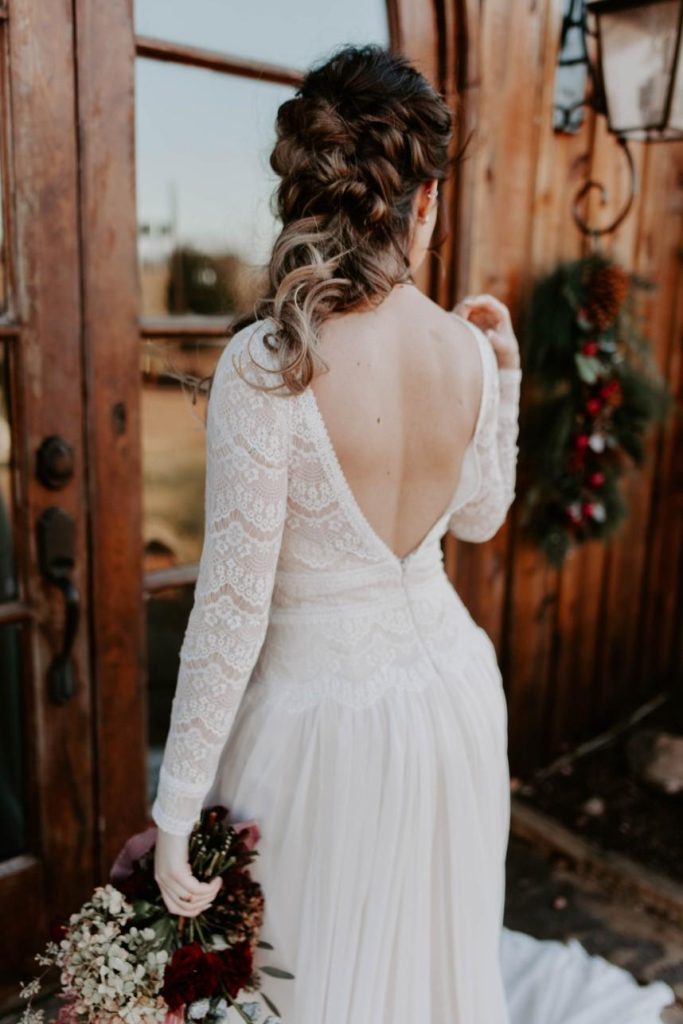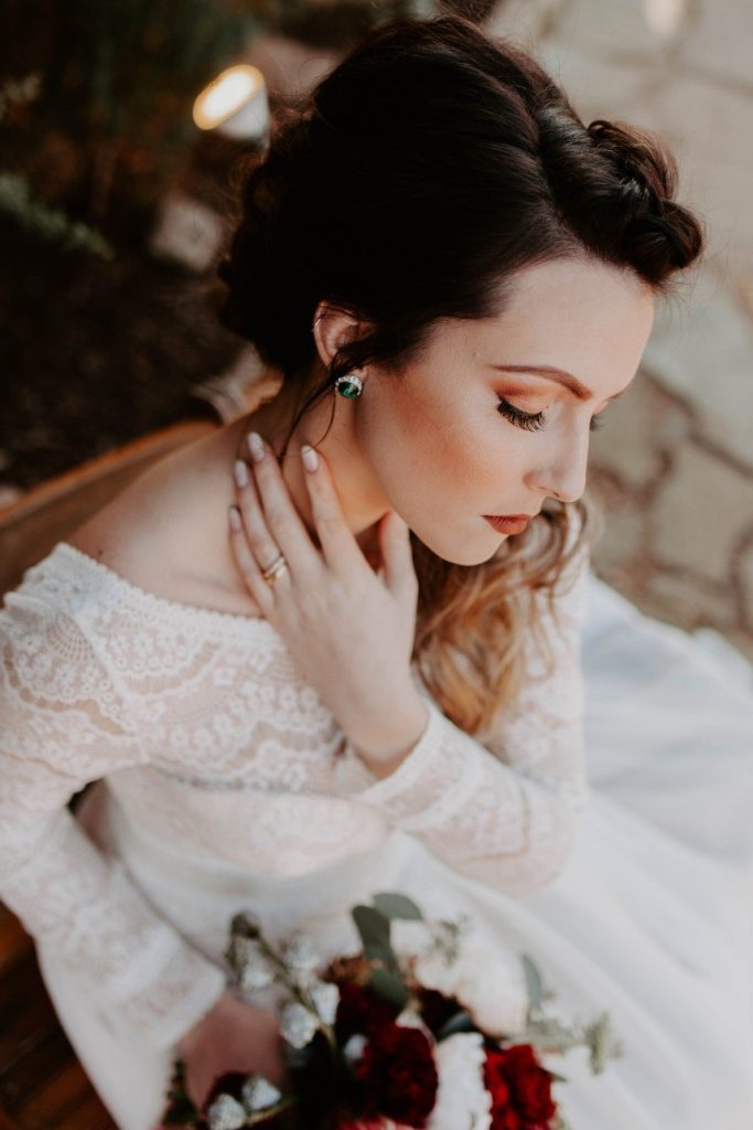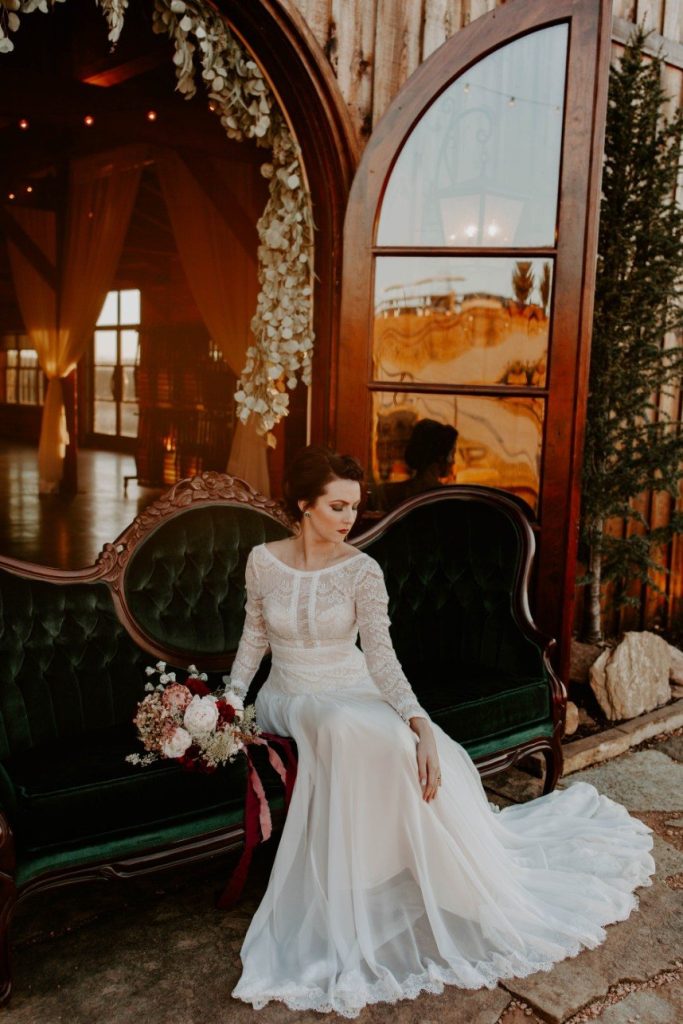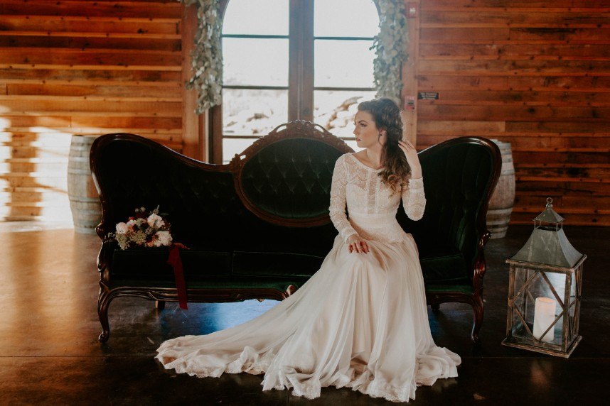 As if we’re caught in a winter wonderland, this chic winter themed styled shoot is dripping with classic red and green elements in the moodiest color palette! Filled with all things festive, the rustic Rosemary Ridge was the perfect venue for this holiday-inspired shoot. Our favorite details, including the trendy, nearly-naked by Amy Cakes topped with gold drip icing and delicately arranged florals by June Sixteenth Events in a variety of wine and white-hued blooms, brought the scene to life. Hints of the wintery holiday are made complete with rustic chic rentals from Grassroots Vintage and and the most stunning emerald green settee from Fancy Couches. Adding the finishing touches on this styled shoot, BRUSHED Salon and Makeup Studio styled the model bride with pristine golden-red hued makeup and a twisted updo. Keep an eye out for earthy feather and geode details and peppermint wedding favors as you scroll through this festive shoot! Cheers to all those celebrating with a holiday wedding this season!