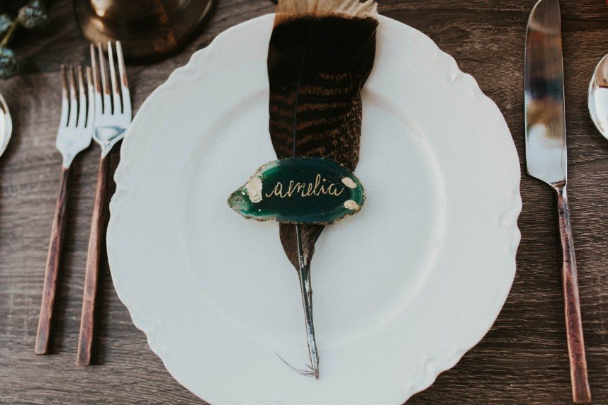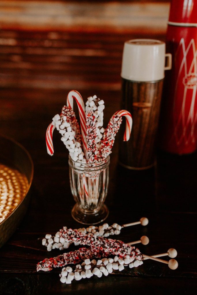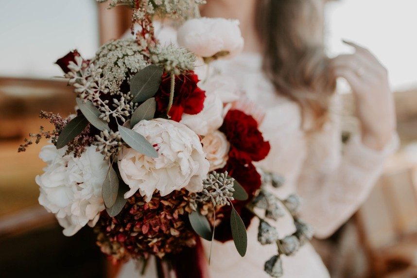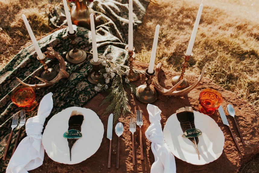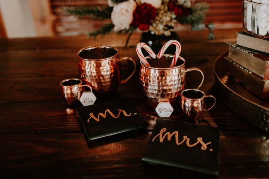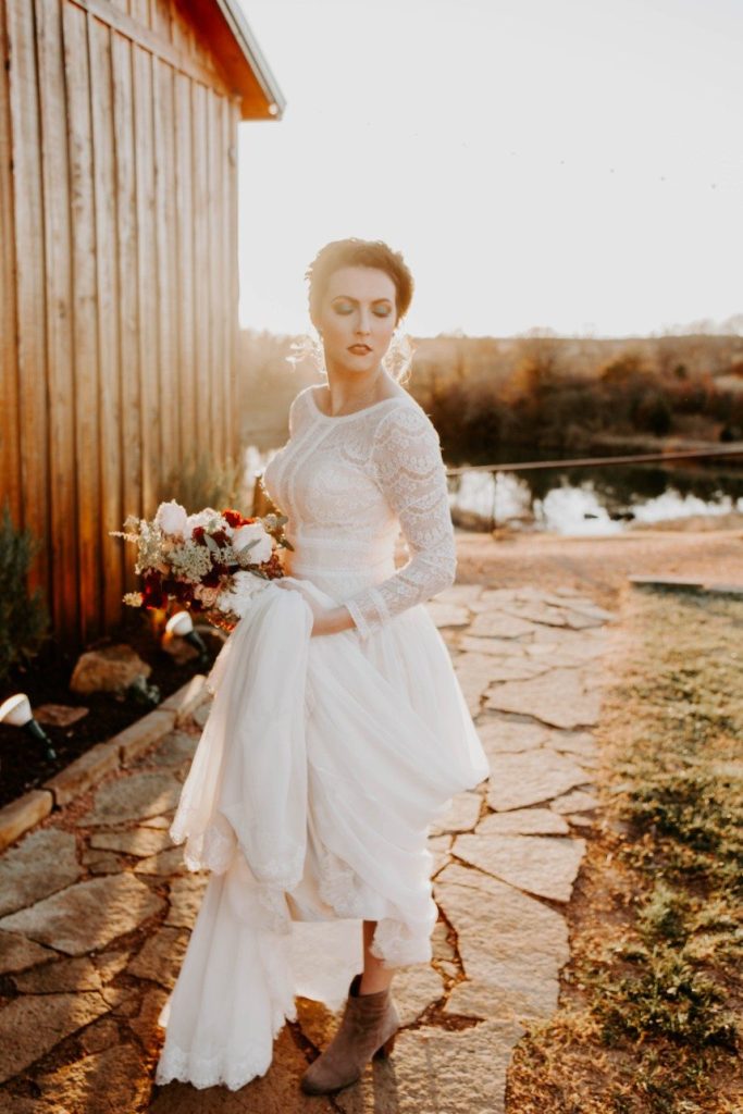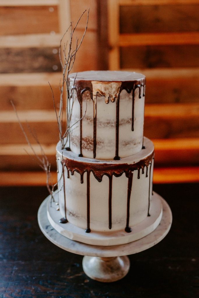 As if we’re caught in a winter wonderland, this chic winter themed styled shoot is dripping with classic red and green elements in the moodiest color palette! Filled with all things festive, the rustic Rosemary Ridge was the perfect venue for this holiday-inspired shoot. Our favorite details, including the trendy, nearly-naked by Amy Cakes topped with gold drip icing and delicately arranged florals by June Sixteenth Events in a variety of wine and white-hued blooms, brought the scene to life. Hints of the wintery holiday are made complete with rustic chic rentals from Grassroots Vintage and and the most stunning emerald green settee from Fancy Couches. Adding the finishing touches on this styled shoot, BRUSHED Salon and Makeup Studio styled the model bride with pristine golden-red hued makeup and a twisted updo. Keep an eye out for earthy feather and geode details and peppermint wedding favors as you scroll through this festive shoot! Cheers to all those celebrating with a holiday wedding this season!