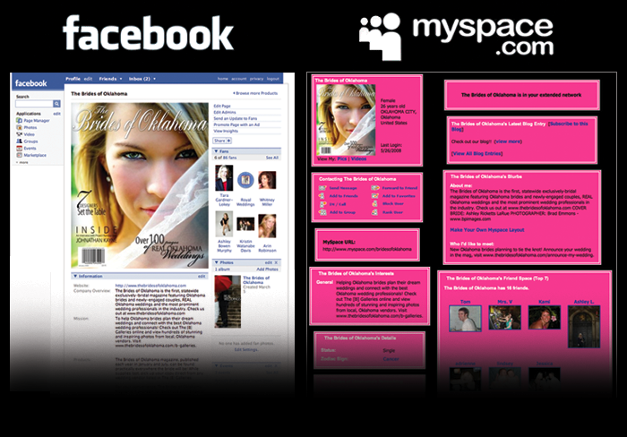 The Brides of Oklahoma magazine is now part of the two biggest social networks on the Web! We would love for you to be our friends on MySpace and fans of our page on Facebook. Not only does it show your support for the magazine, but we also try to keep you up to date on bridal shows, events and the latest happenings in the Oklahoma bridal industry. You can find us by searching The Brides of Oklahoma on MySpace and on Facebook. We look forward to becoming your friend!