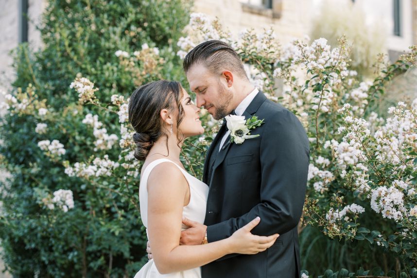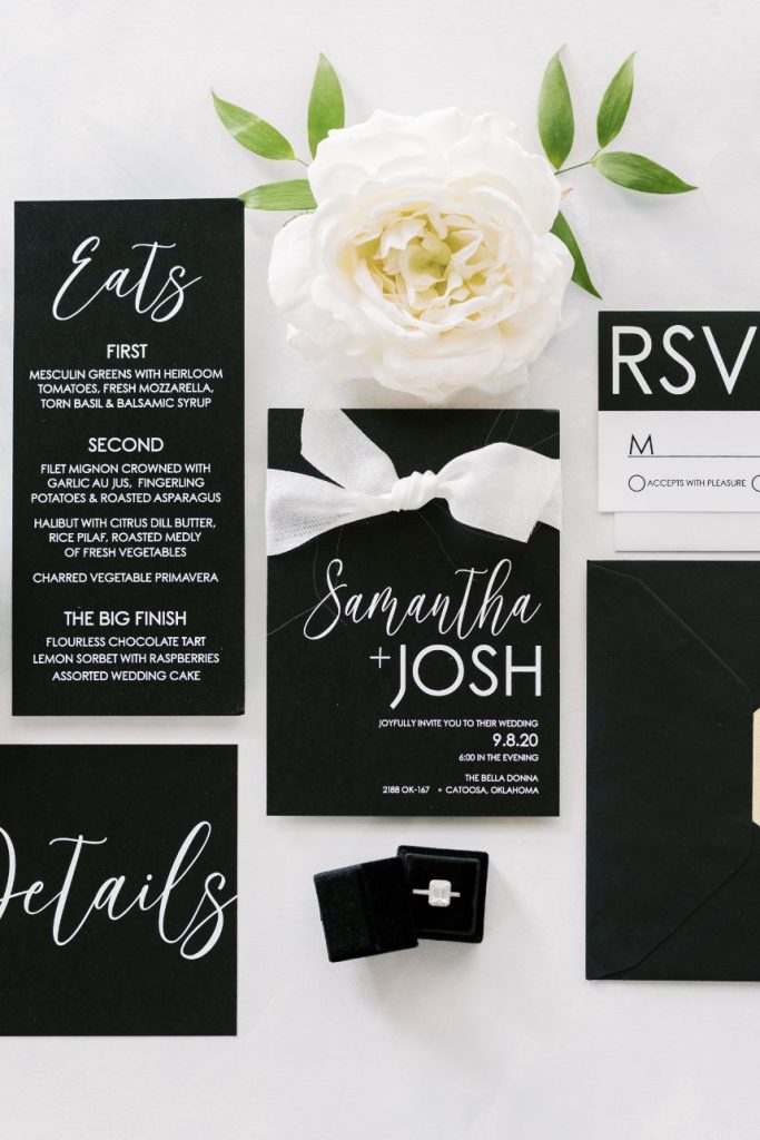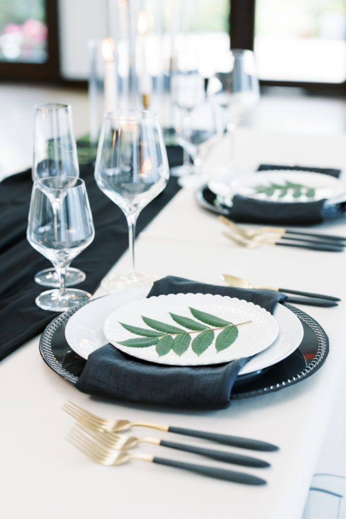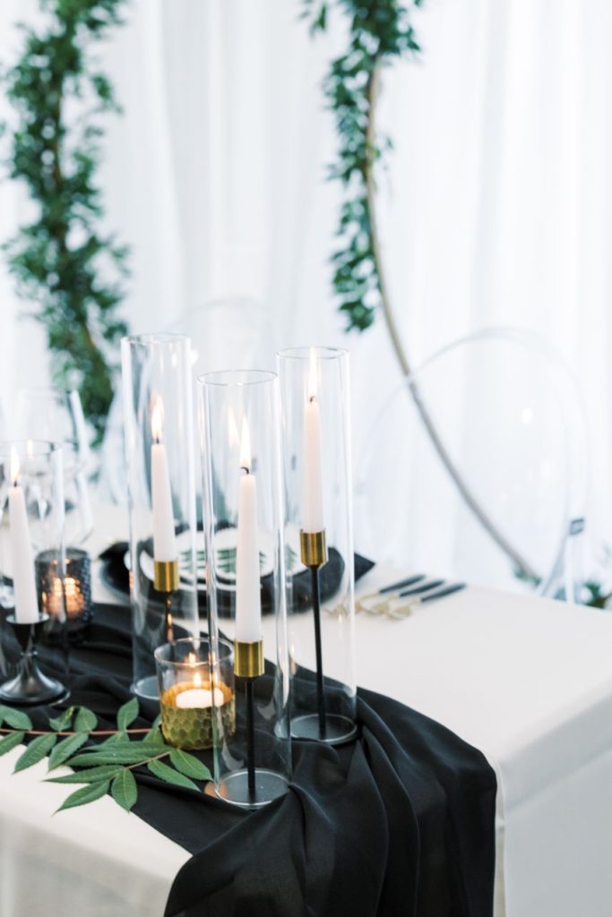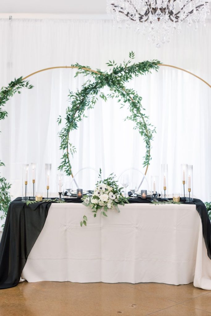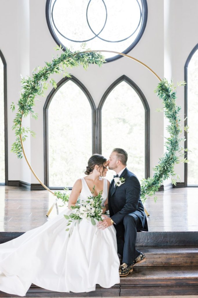 You don’t have to beat around the bush, we know you’re right there with us crushing on this modern woodland wedding inspiration captured in bright, timeless shots by Andi Bravo Photography! So much greenery was used in this styled shoot to really set a tone and in its strategic use, we love that it only draws more attention back to the natural beauty of the venue. With a few gilded vintage touches, these reception tablescapes are understated yet still stand out as being uniquely beautiful. Geometric décor and high contrast pieces from Party Perfect Event Rental + Design create the mod vibe that we see carried throughout these scenes, most notably in flatlays of fine wedding paperie. Black and white weddings can be so classic and sophisticated, but including even more black in a wedding palette can make a soiree feel slightly more moody, masculine and stately! This one complemented the black trim accents of The Bella Donna Wedding Chapel & Event Center perfectly. Read on for a note from the venue owners about behind the scenes of this modern woodland wedding inspiration. Cheers!