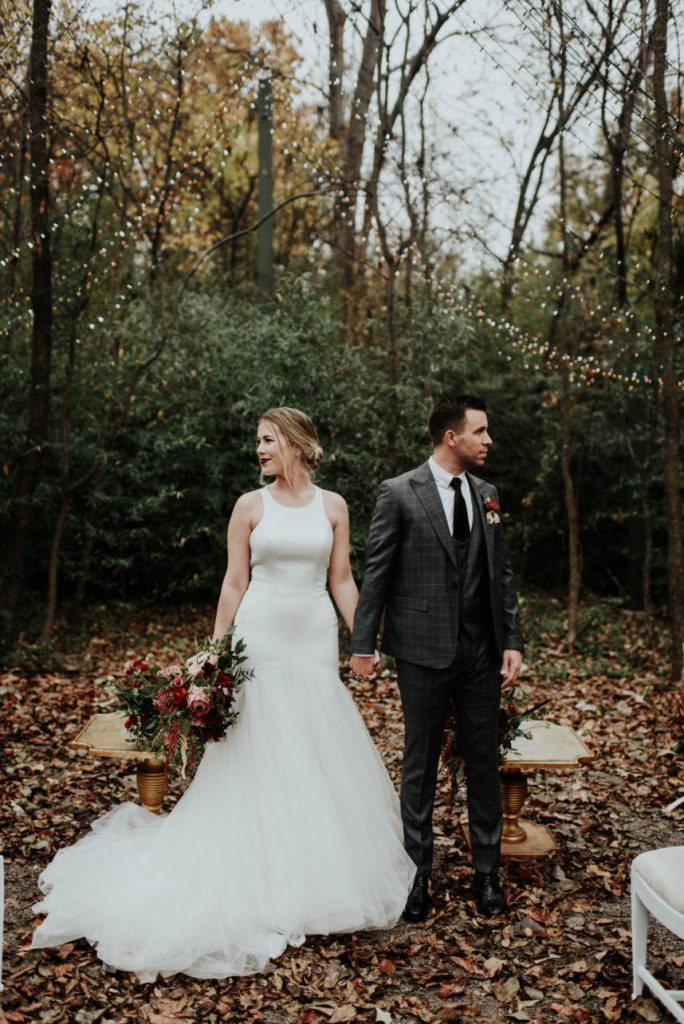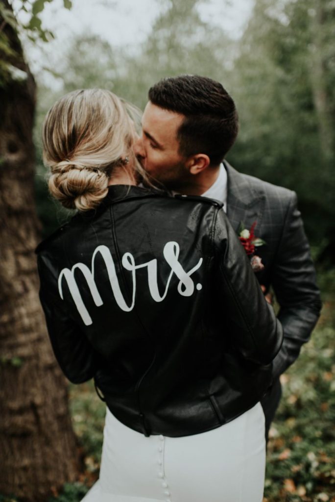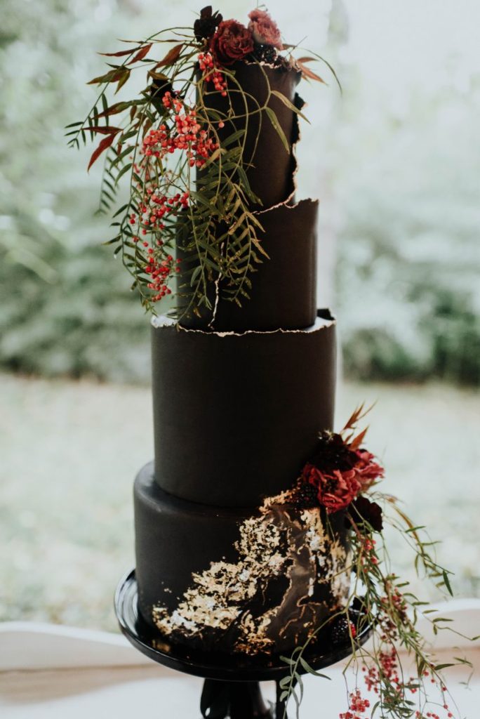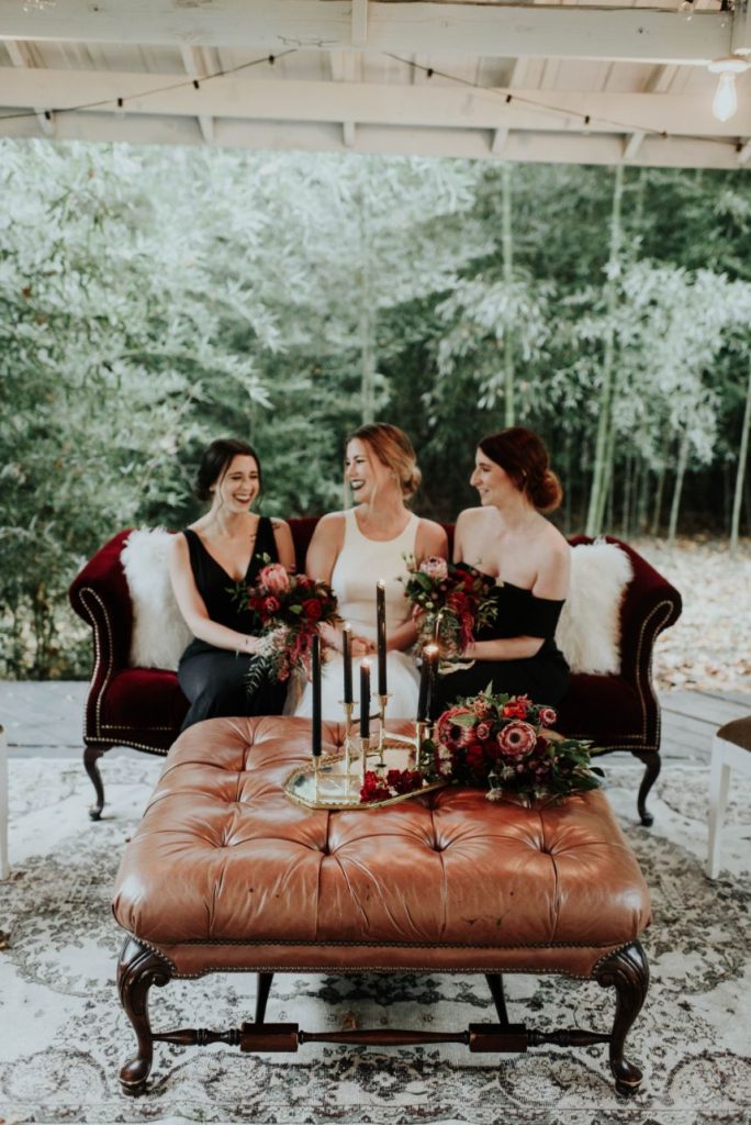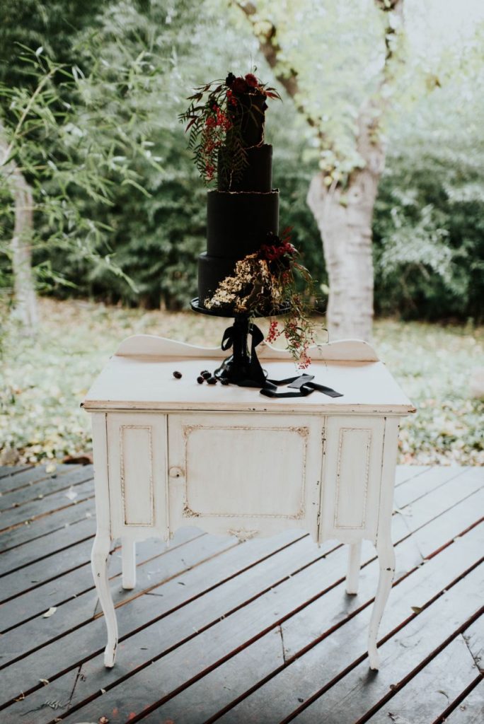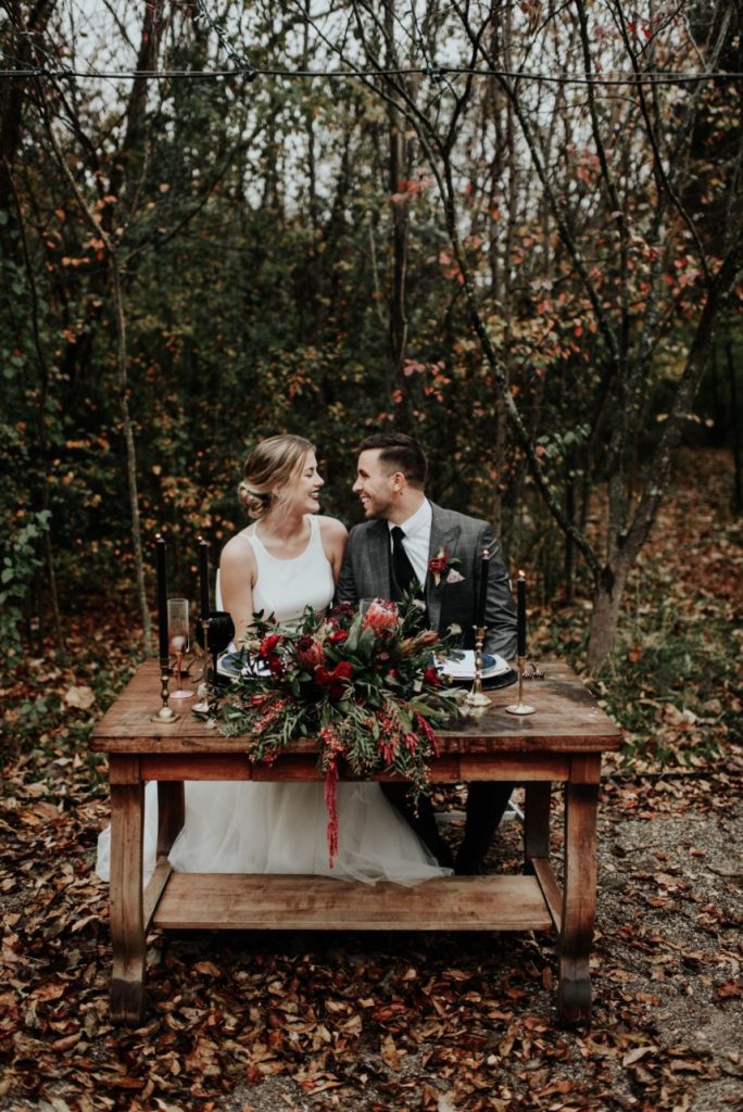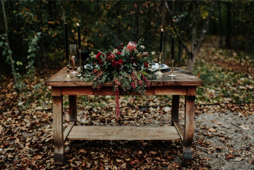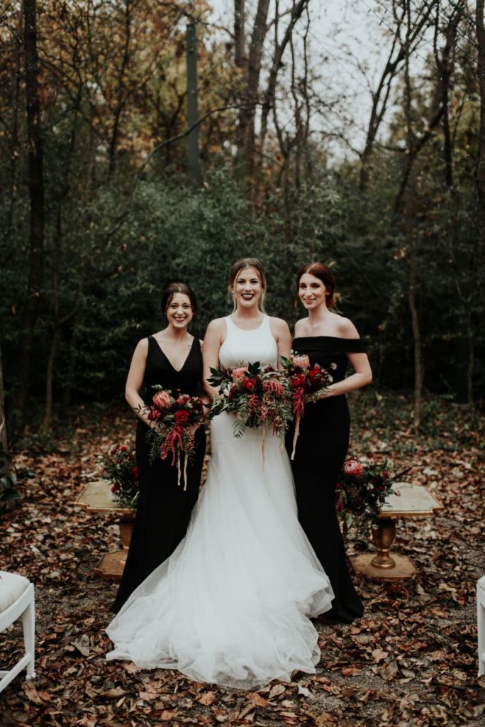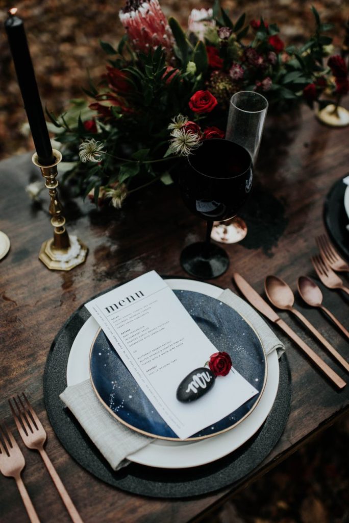 An enchanted forest comes to life in this woodsy modern fairy tale wedding scene from Embellished Weddings! A contemporary invitation suite sets the tone with a dark palette and modern vibes. That same aesthetic weaves its way into every detail, from the celestial-detailed and metallic place settings with plenty of textured linens, to the organic and overflowing florals by The Medieval Garden featuring wild berries, romantic roses and soft fronds. Runaway Belle provided a dreamy selection of vintage furniture for an intimate gathering. To complement the groom’s new-age plaid suit, the bride wore a contemporary high-neck fit-and-flare gown from Prescott Bridal, flanked by beautiful bridesmaids in black, outfitted by Prim. An all-black cake by Amy Cakes and hand-painted canvas sign and leather jacket bring even more flair to this woodsy modern scene Embellished Weddings oh-so-beautifully designed, and we are here for it all. Enjoy these photos!