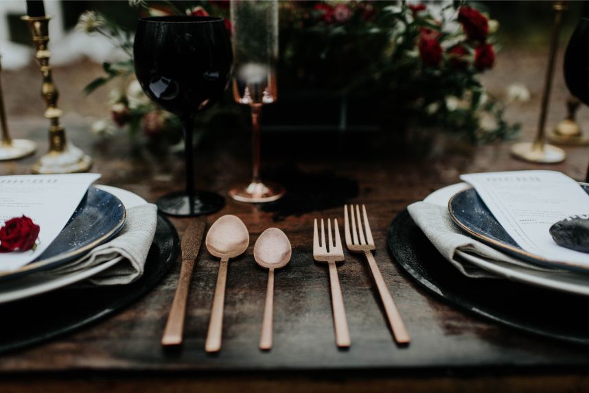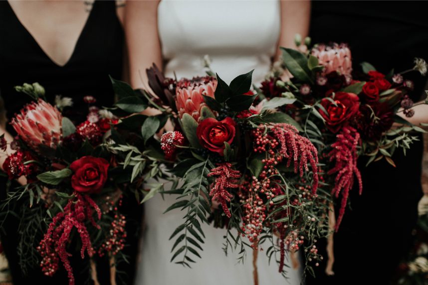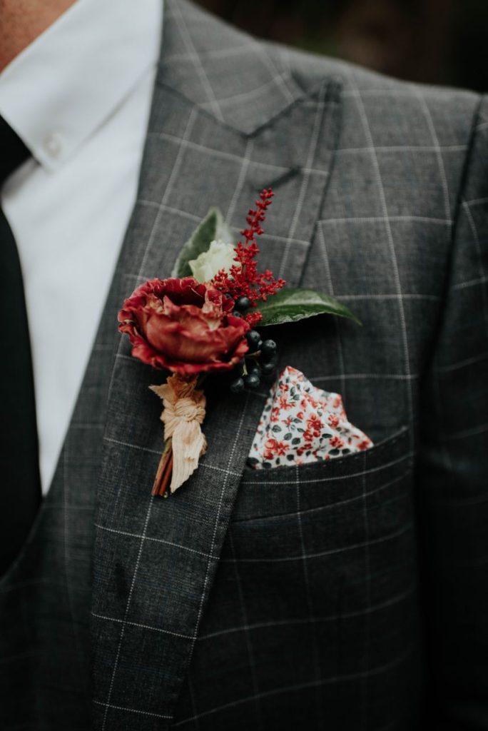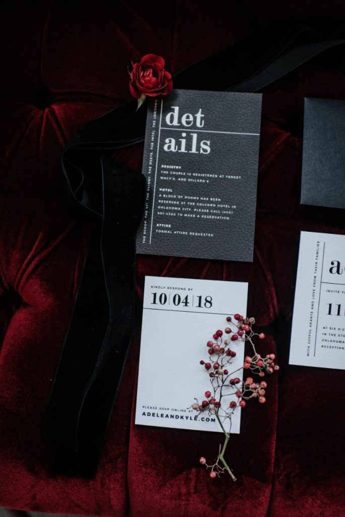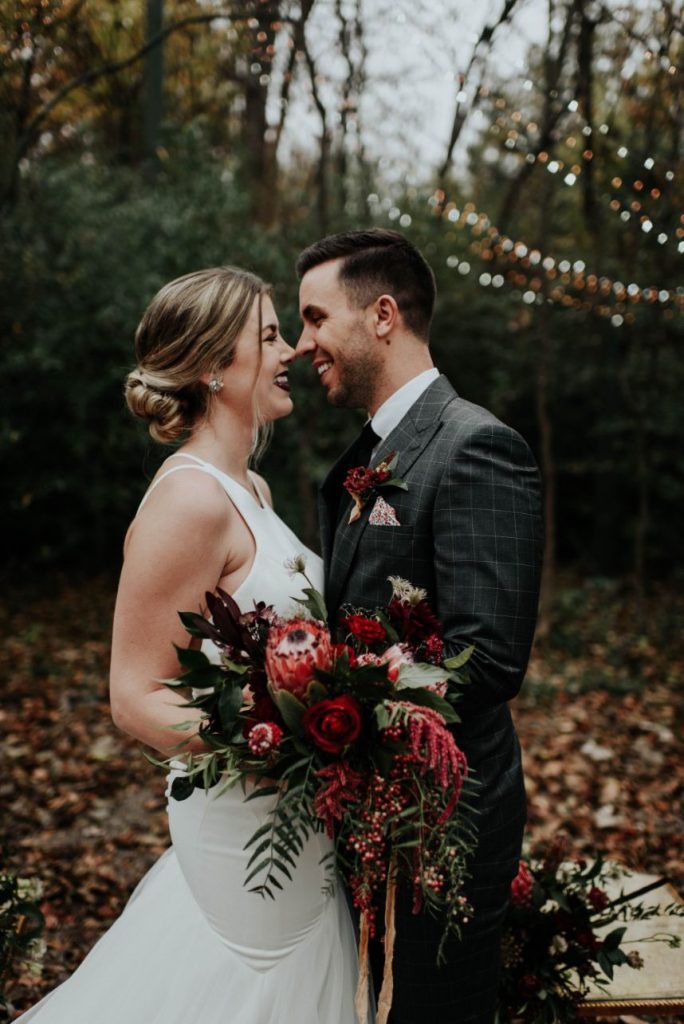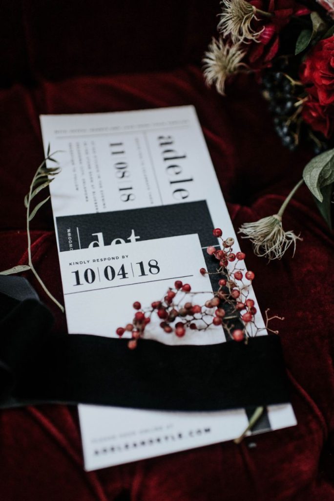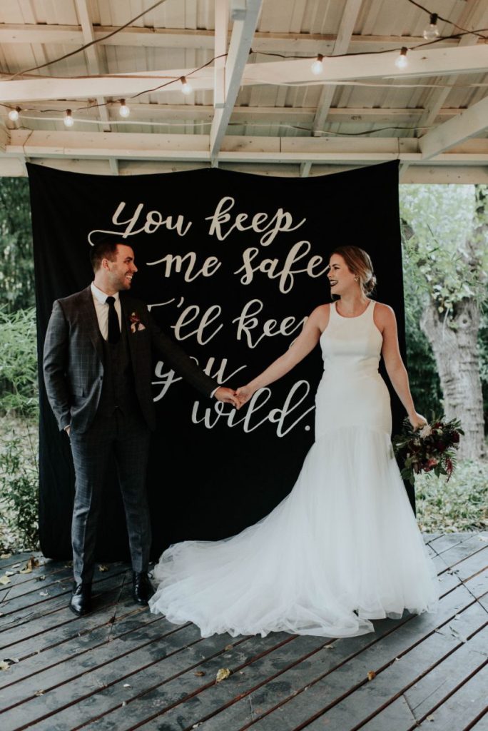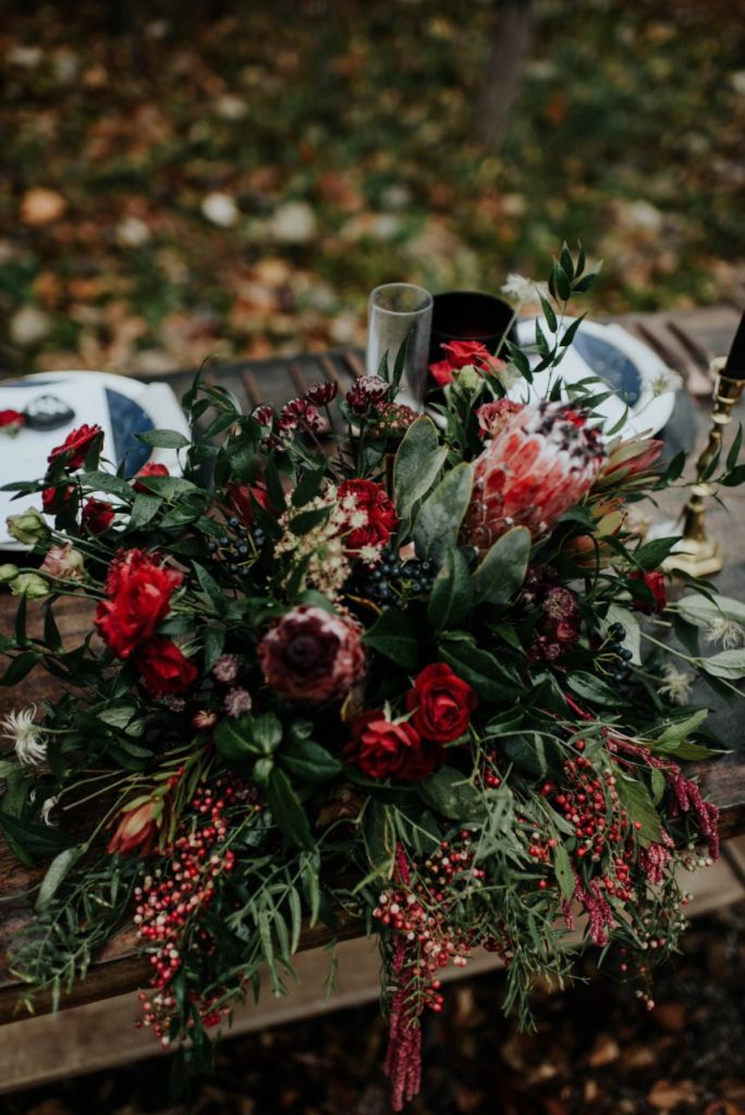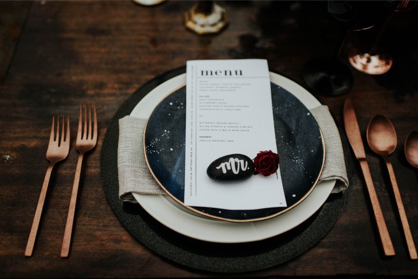 An enchanted forest comes to life in this woodsy modern fairy tale wedding scene from Embellished Weddings! A contemporary invitation suite sets the tone with a dark palette and modern vibes. That same aesthetic weaves its way into every detail, from the celestial-detailed and metallic place settings with plenty of textured linens, to the organic and overflowing florals by The Medieval Garden featuring wild berries, romantic roses and soft fronds. Runaway Belle provided a dreamy selection of vintage furniture for an intimate gathering. To complement the groom’s new-age plaid suit, the bride wore a contemporary high-neck fit-and-flare gown from Prescott Bridal, flanked by beautiful bridesmaids in black, outfitted by Prim. An all-black cake by Amy Cakes and hand-painted canvas sign and leather jacket bring even more flair to this woodsy modern scene Embellished Weddings oh-so-beautifully designed, and we are here for it all. Enjoy these photos!