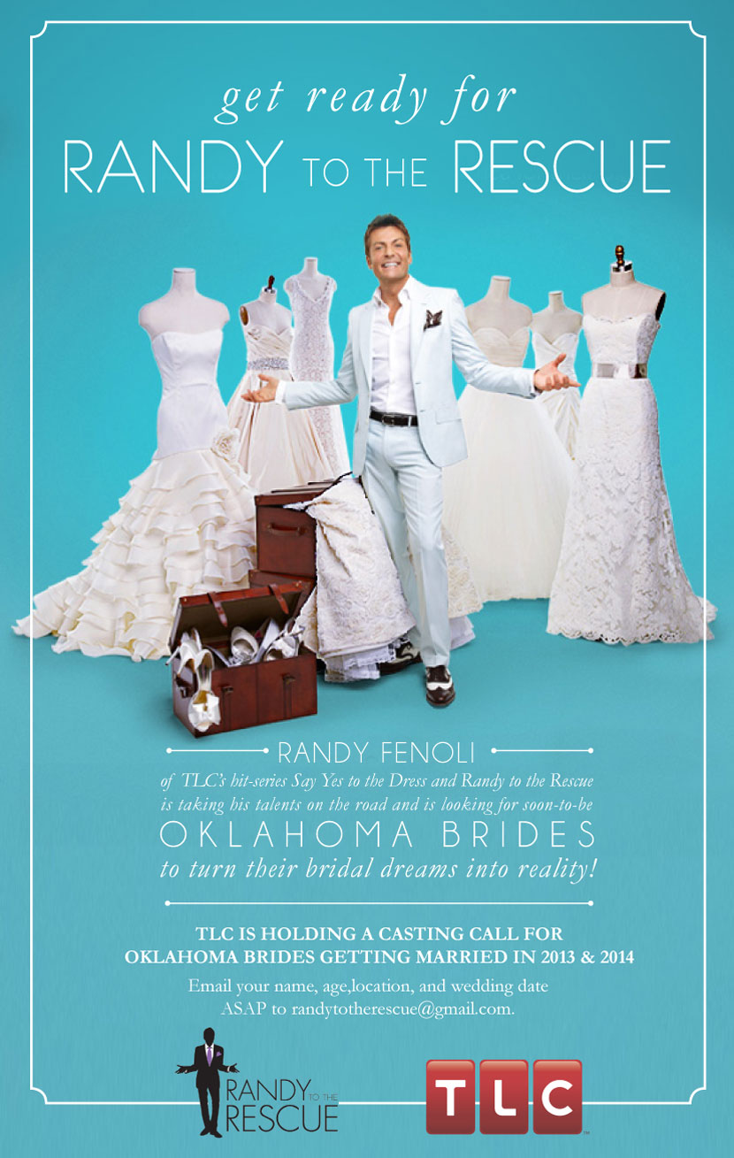 We have some incredibly exciting news! TLC’s “Say Yes to the Dress” fashion expert, Randy Fenoli, is heading off the floor of Kleinfeld and behind the wheel of a big rig to bring handpicked designer gowns to you! TLC is currently casting Season 2 of their hit show “Randy to the Rescue,” and are looking for Oklahoma brides getting married in 2013 or 2014. If interested, email your name, age, location and wedding date to [email protected]. We hope to see you on TV! Cheers!