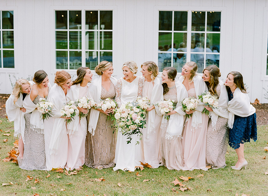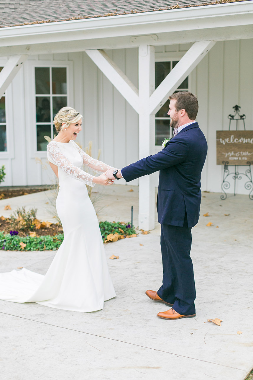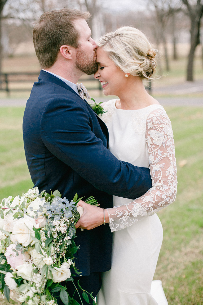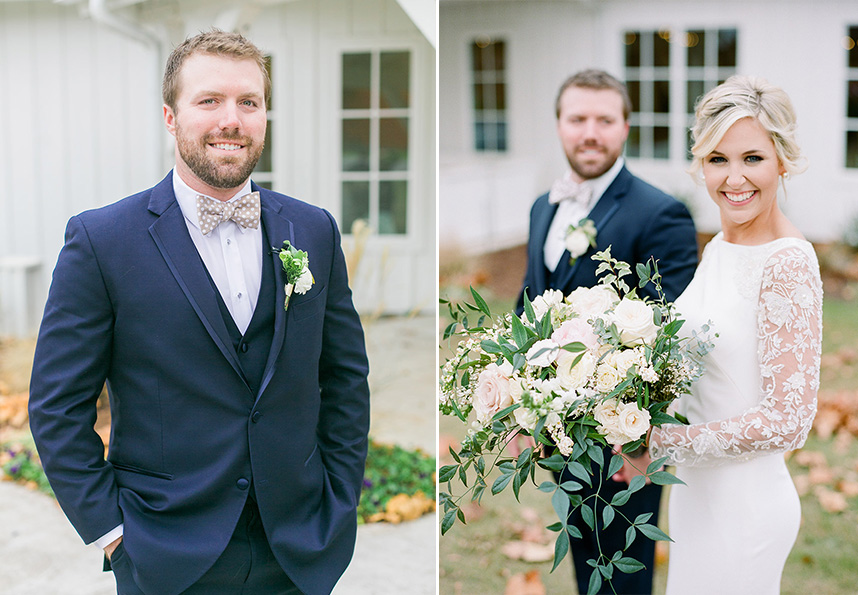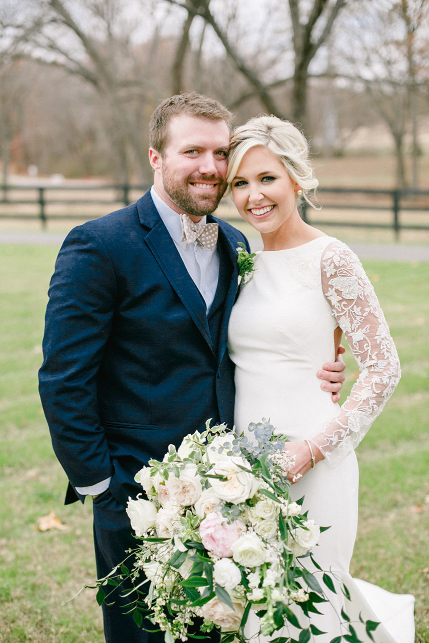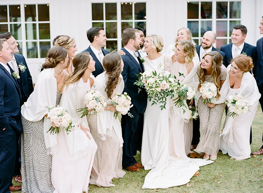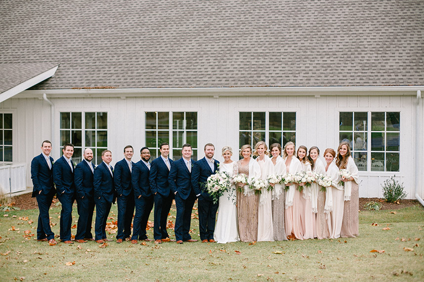 Teale and Josh’s romantic winter wedding featured a tone of traditional elegance with a hint of modern flair. Spain Ranch set the scene with the most perfect decor and rentals from Party Pro Rents, fitting perfectly into Teale’s color scheme of navy, cream and blush with pops of gold. Crisp white chairs paired with neutral table settings gave their reception space a classically polished feel. Breathtaking florals from Juniper Designs flooded the venue, from the bride and bridesmaids’ bouquets to the table centerpieces and even the cake, these blooms wowed! The bride looked gorgeous walking down the aisle in an ivory crepe mermaid gown with hand-beaded tulle sleeves from J.J. Kelly Bridal Salon and flawless makeup by Chelsey Ann Artistry. Invitations from Rachel Kathryn Designs fit the couple’s theme perfectly. Josh was clean-cut in his navy suit and wedding ring from BC Clark Jewelers. Pen Weddings did a phenomenal job of capturing every sweet detail from Teale and Josh’s special day in the video below. We’re swooning over this dreamy winter soiree!