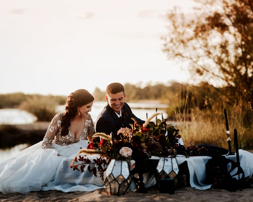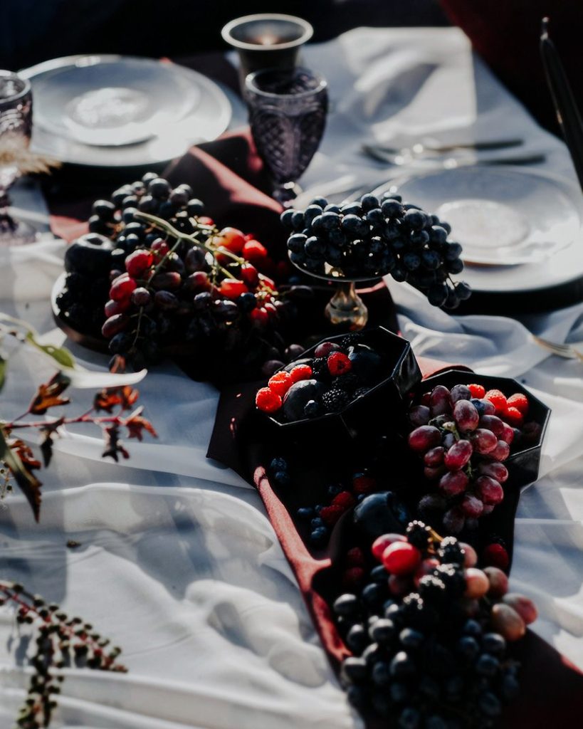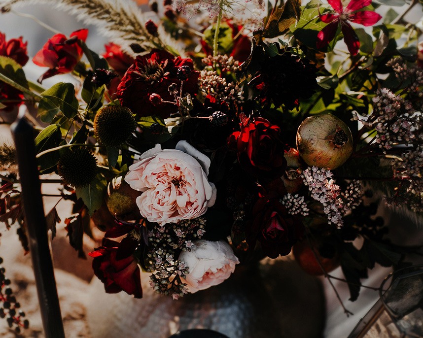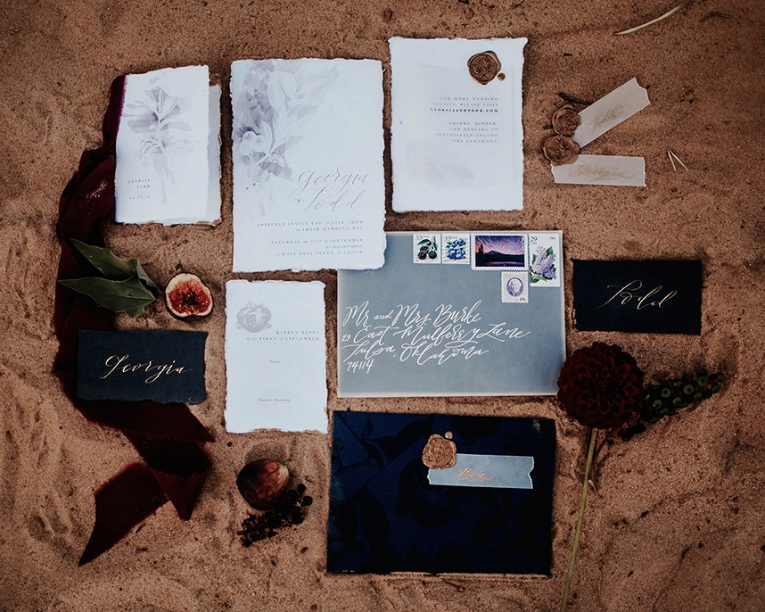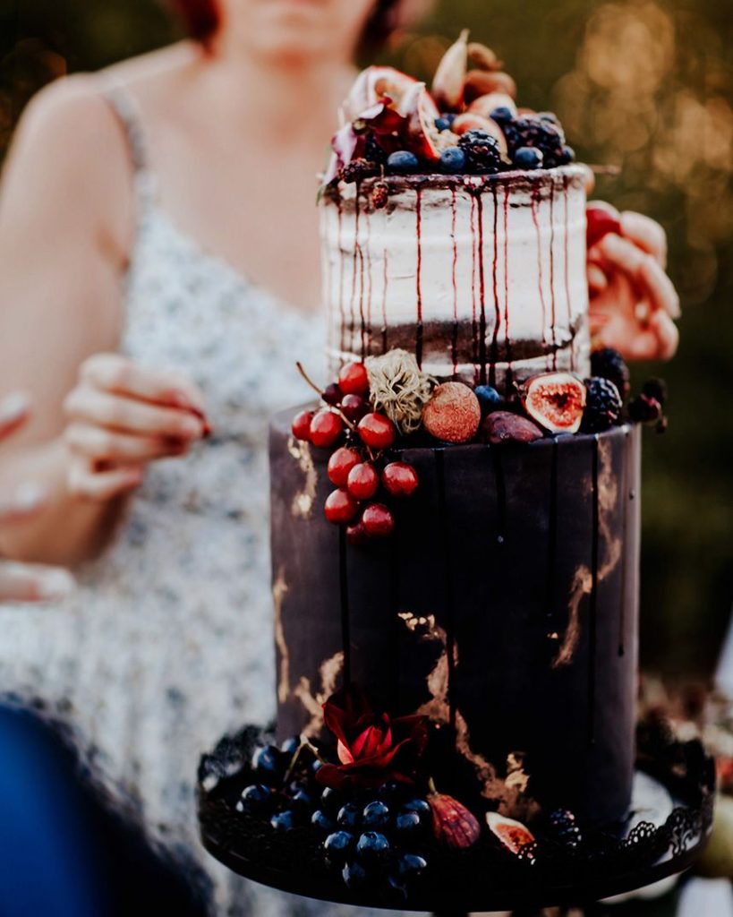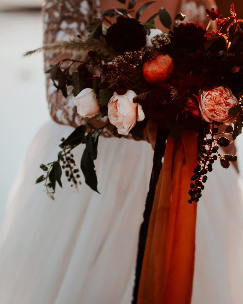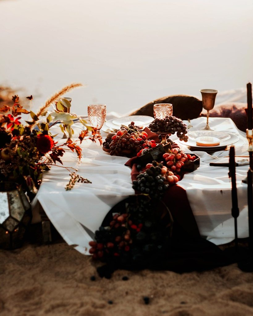 Inspired by the gorgeously deep hues of dark fruit, Malyn Made Weddings designed this show-stopping, moody styled shoot to prove that the wedding of your dreams can come to life just about anywhere! From the stunning, half-naked wedding cake courtesy of Sweet Devotion Cakery to the glamorous rentals from Party Pro Rents, this earthy and natural shoot is truly one-of-a-kind! Laurel & Marie created the most beautiful invitations and went above and beyond by hand-writing the menu on the edge of each dish. Romantic floral arrangements included pomegranates, blackberries and pears to emphasize the theme of the day. Keep scrolling for your daily dose of wedding inspiration and look out for a word from the planner! Cheers!