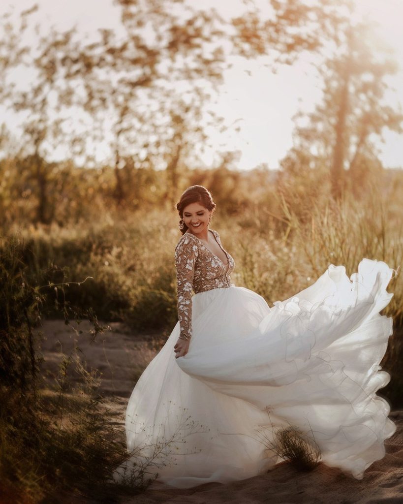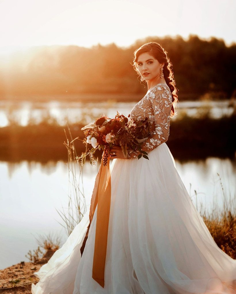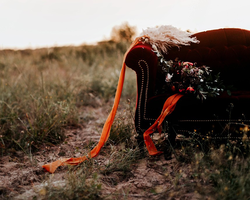 From the planner: “In the little, big town of Tulsa, Oklahoma, when you see a photo, it is usually recognizable as to where it was taken. Our goal was to find a location that people wouldn’t identify as Tulsa. Couples should dream, and this imagination shouldn’t be limited to the ordinary of the city. In doing this, the locals wouldn’t be distracted by the cliché look of an Oklahoma wedding. By the Arkansas River, we wanted to show couples that any location could be transformed into the wedding of their dreams. The most important aspect is choosing an amazing team of vendors that perfectly fits the couple’s style, personality and dream. Fruit was our inspiration for the styled shoot. The florist incorporated pomegranates, blackberries and pears into the bridal bouquet and centerpiece, while the half-naked wedding cake was covered with a blackberry drizzle and topped with figs, grapes, blackberries and passion fruit.”