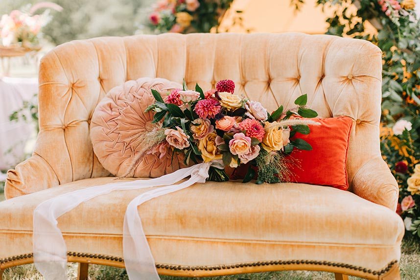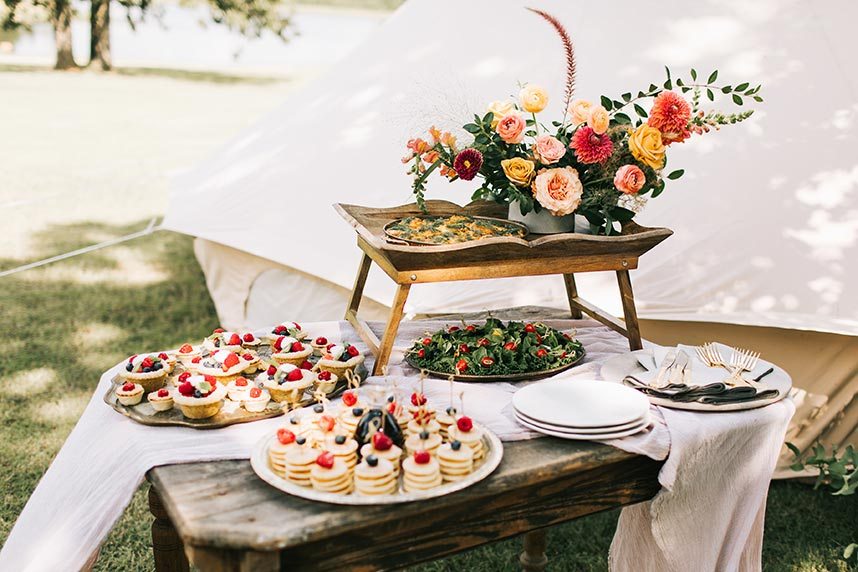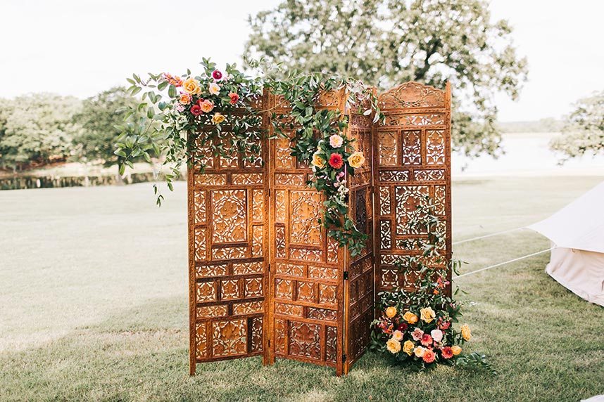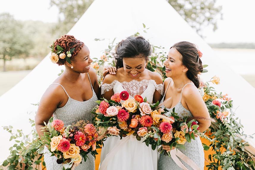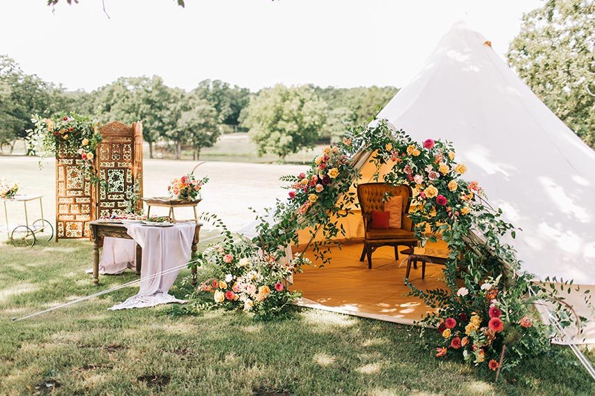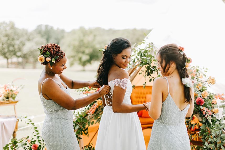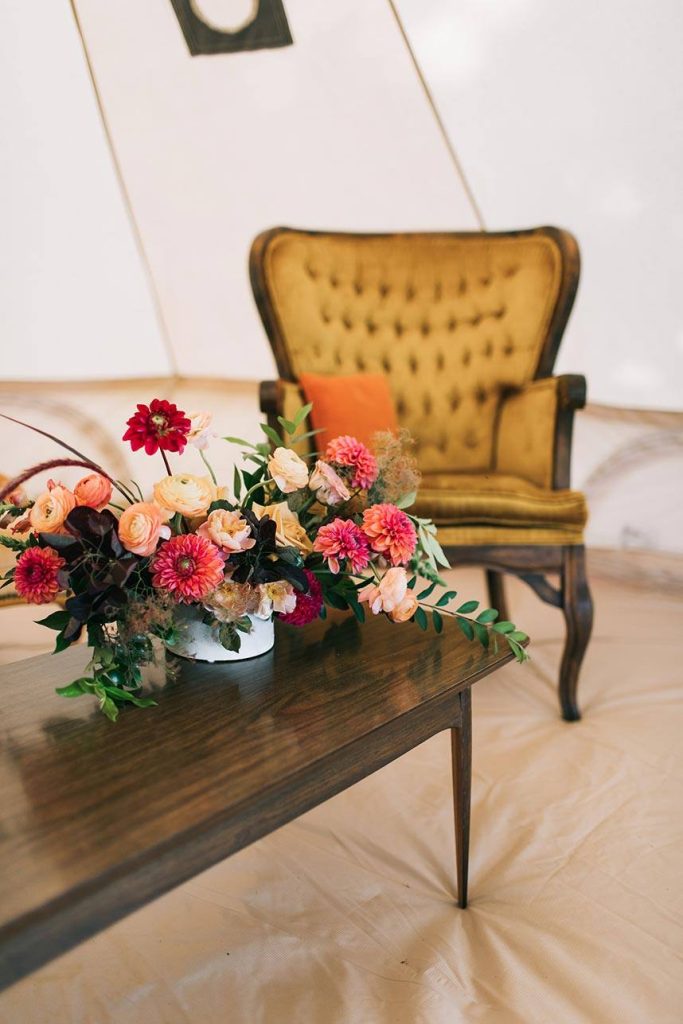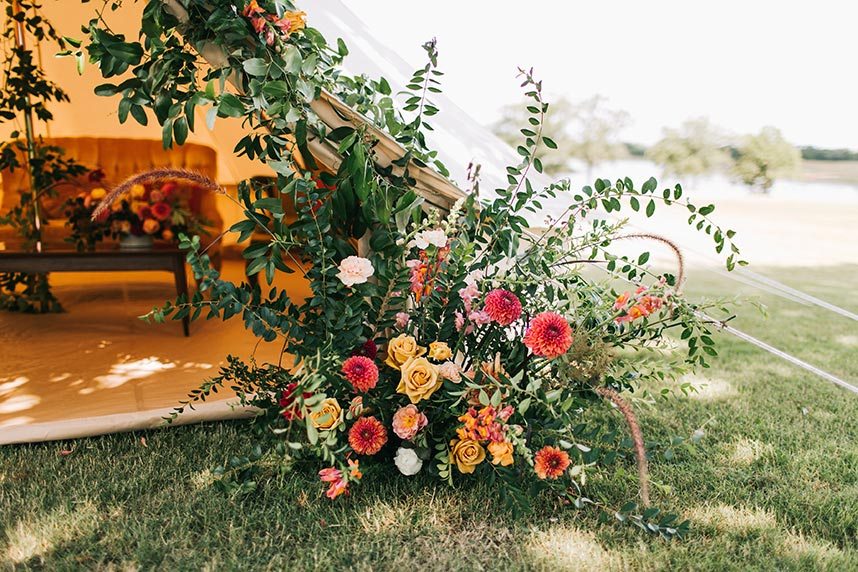 From the planners, Katie & Taylor from Ever Something: “We took a great deal of inspiration from the beautiful tent from Homma Camp Co. For the overall shoot and the florals, we wanted everything to feel natural, to be outside of the box, and use a color palette that is experienced often through sunsets in Oklahoma. We wanted to show an alternative setting for a bride and her bridesmaids who are getting ready for the wedding in an outdoor setting. Tatanka Ranch was the perfect backdrop for the shoot, and it truly didn’t feel like we were in Central Oklahoma.”