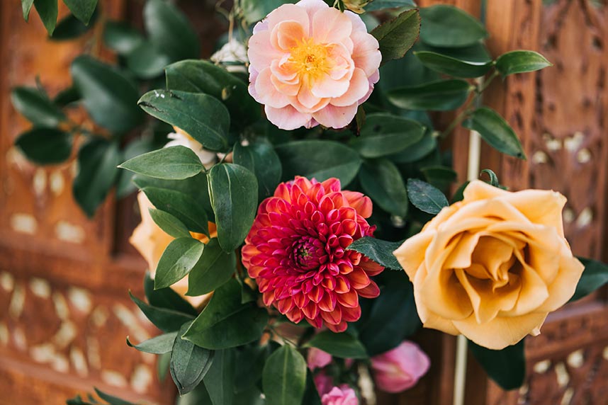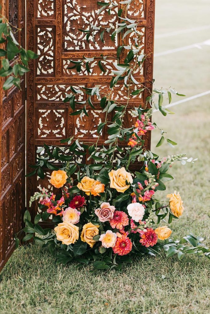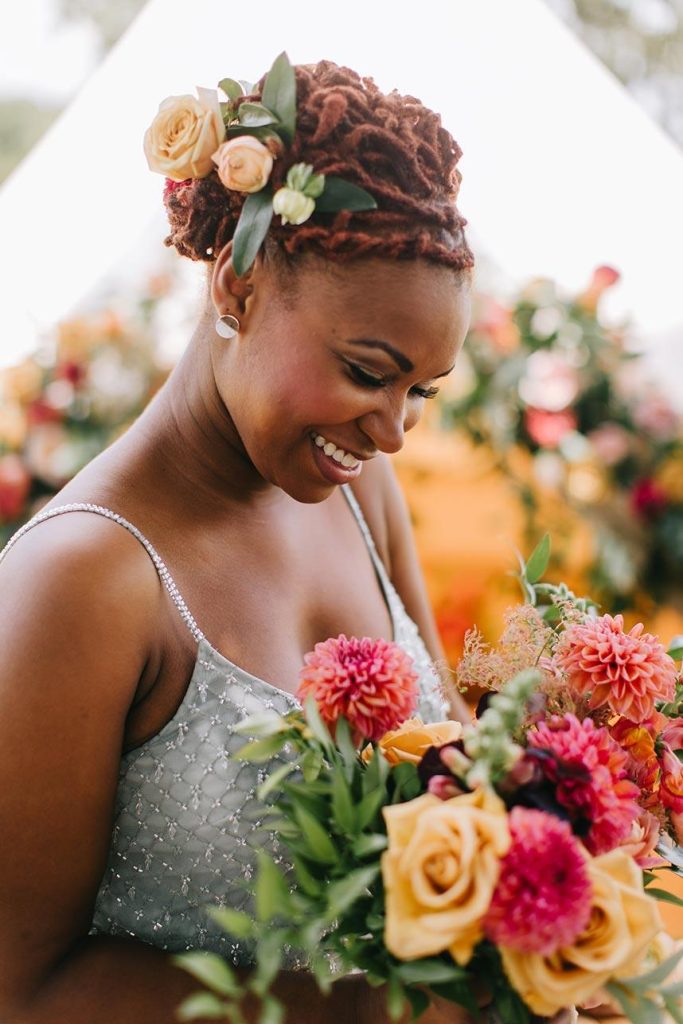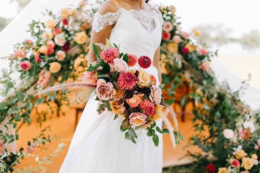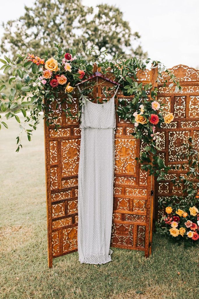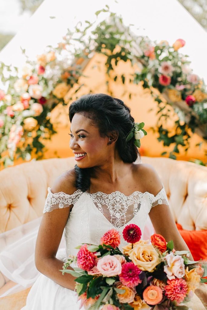 From the planners, Katie & Taylor from Ever Something: “We took a great deal of inspiration from the beautiful tent from Homma Camp Co. For the overall shoot and the florals, we wanted everything to feel natural, to be outside of the box, and use a color palette that is experienced often through sunsets in Oklahoma. We wanted to show an alternative setting for a bride and her bridesmaids who are getting ready for the wedding in an outdoor setting. Tatanka Ranch was the perfect backdrop for the shoot, and it truly didn’t feel like we were in Central Oklahoma.”