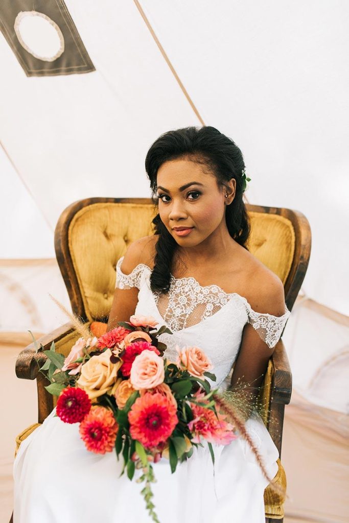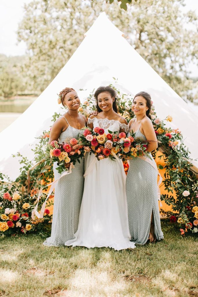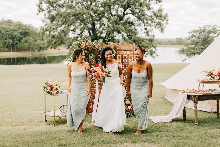 Today we could not be more excited to share this stunning scenic oasis wedding inspiration shoot from Ever Something! Captured by the oh-so talented Sarah Libby Photography, this setting oozes with natural beauty thanks to the gorgeous lake-side scenery at Tatanka Ranch. Homma Camp Co. and La Vintage offered a unique combination of vintage charm and alternative style to cultivate the dreamiest display. Our glowing bride and her maids look flawless with hair and makeup from Faccia Bella and attire from Bridal Couture By Sonni and Prim Bridesmaid Boutique. Keep scrolling for some breathtaking outdoor wedding inspo and a word from the visionaries at Ever Something! Enjoy!