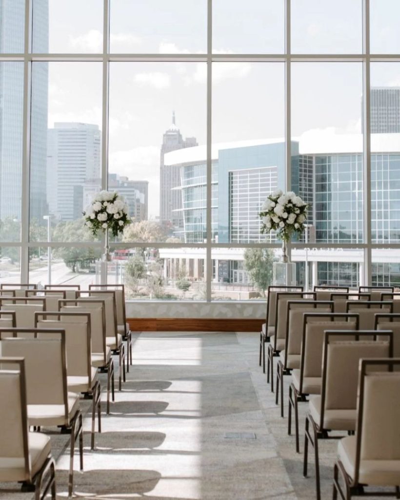 The Tulsa Club Ballroom sits on our 9th & 10th floor and overlooks the Deco Tulsa skyline. Our rooftop event space offers an outdoor terrace and views of the eastern skies from our 11th floor. Full catering options available and luxury guest accommodations including our largest suite, the "Petite Lounge Suite" which boasts a 1927 mosaic fireplace and space for all your bridal needs.