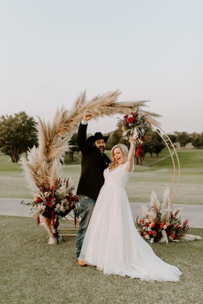 Moody Boho Chic Wedding Featuring A Trendy Pampas Grass Altar